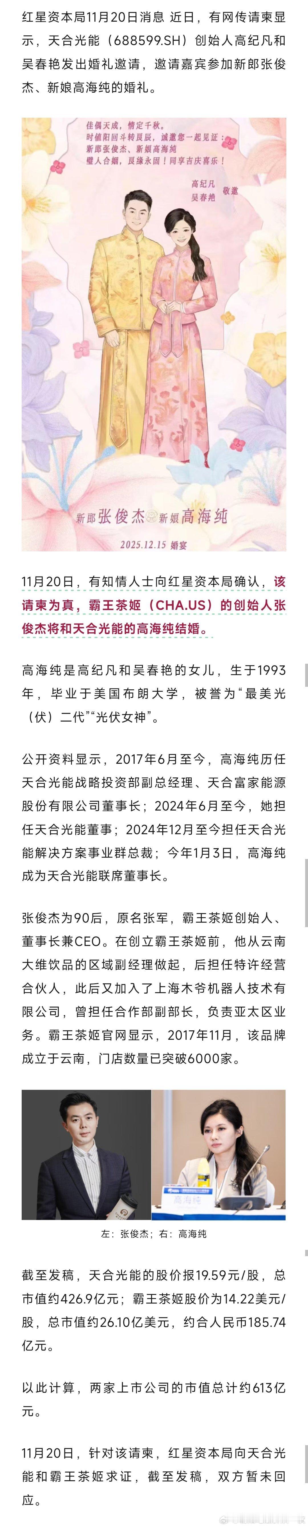 据媒体报道,霸王茶姬90后创始人张俊杰,将与“最美光二代”高海纯结婚,女方为天合光能董事长。