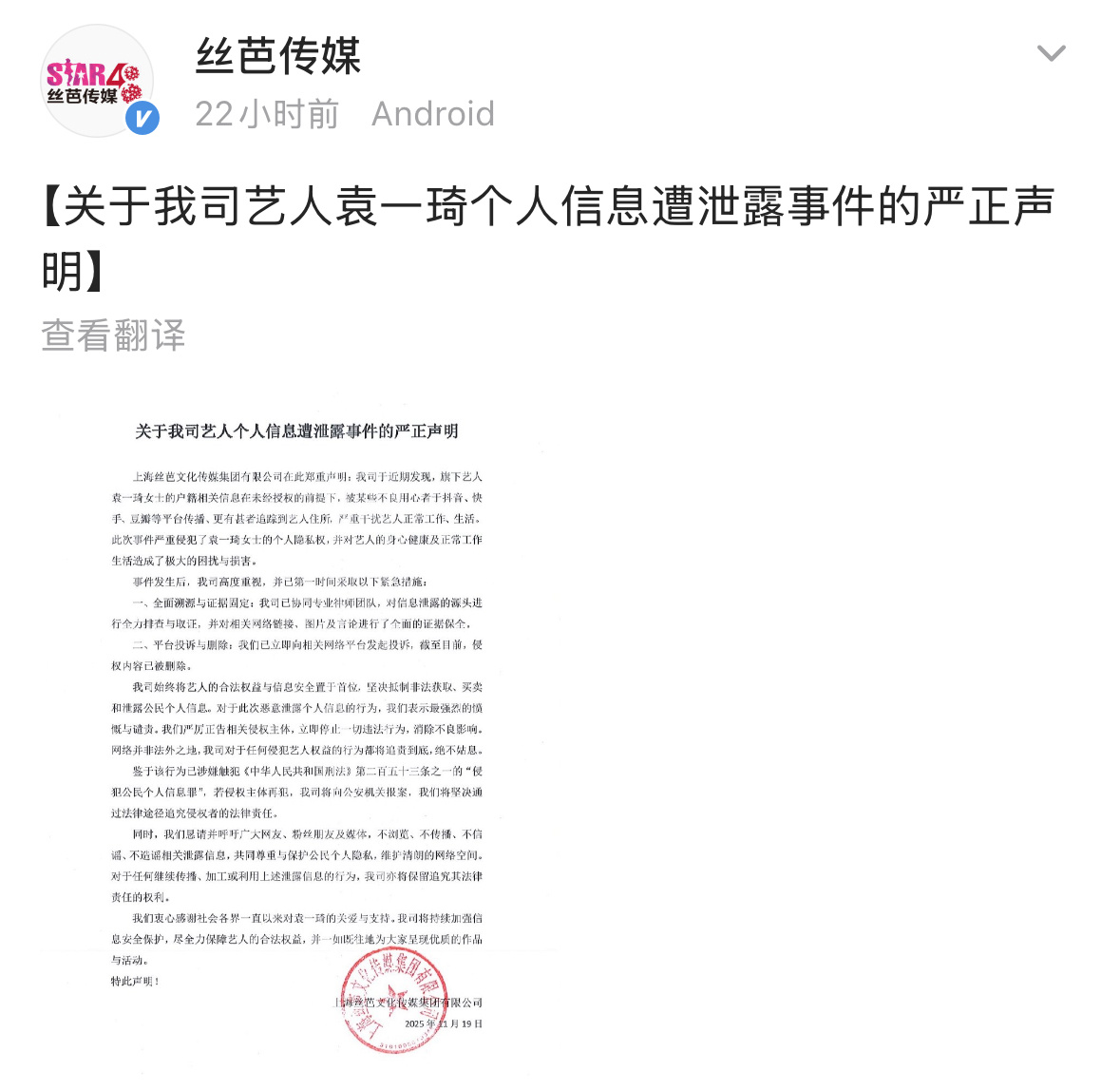 袁一琦工作室发布抵制私生的严正声明omg……在昨天发布声明后,还有人跟车到艺人住