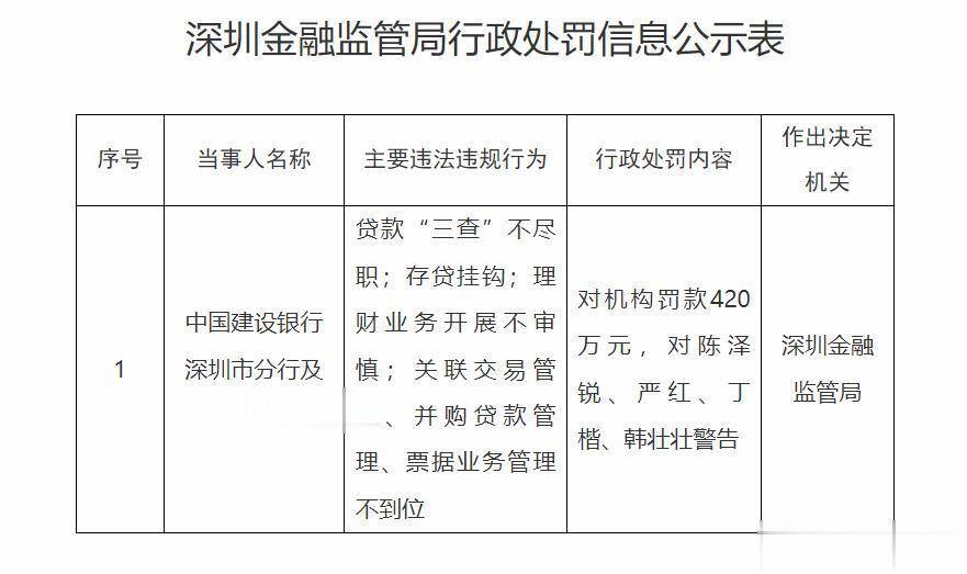 中国建设银行深圳市分行因多项违规操作,被处以420万元的罚款,同时四名相关责任人也受到了警告处分。