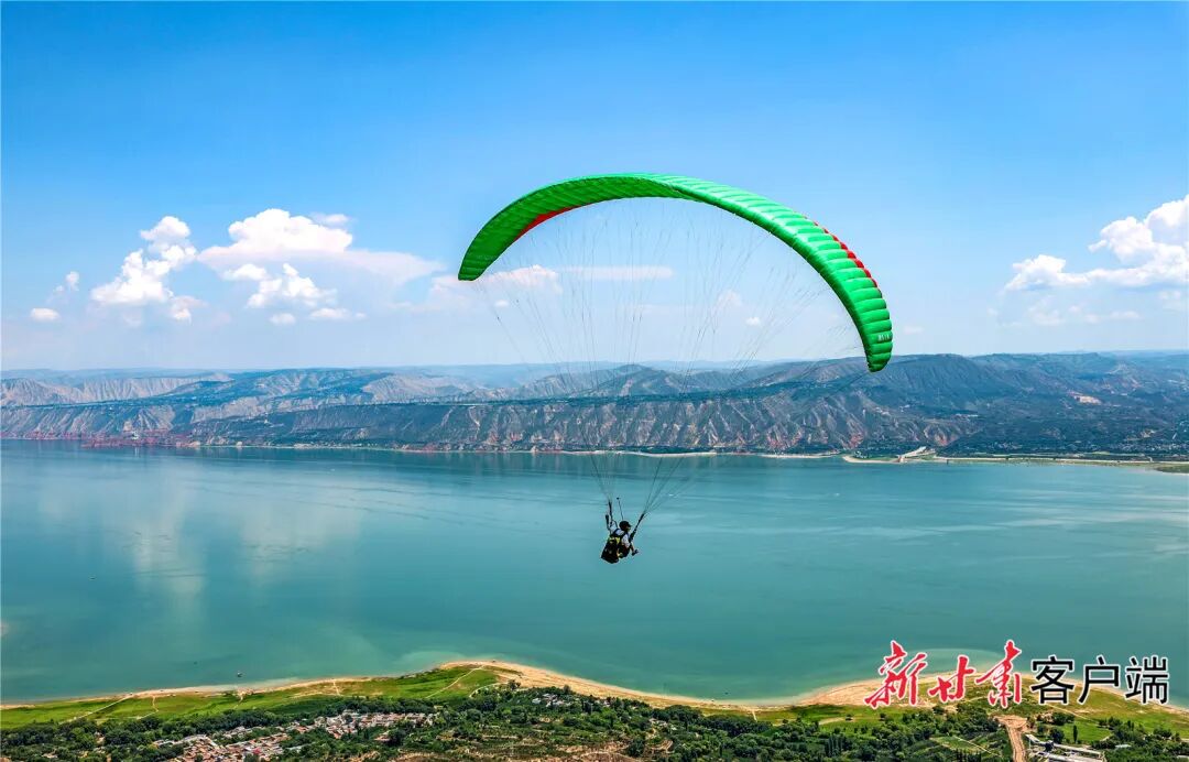 在碧波万顷的永靖县黄河三湾景区,游客体验滑翔伞项目。