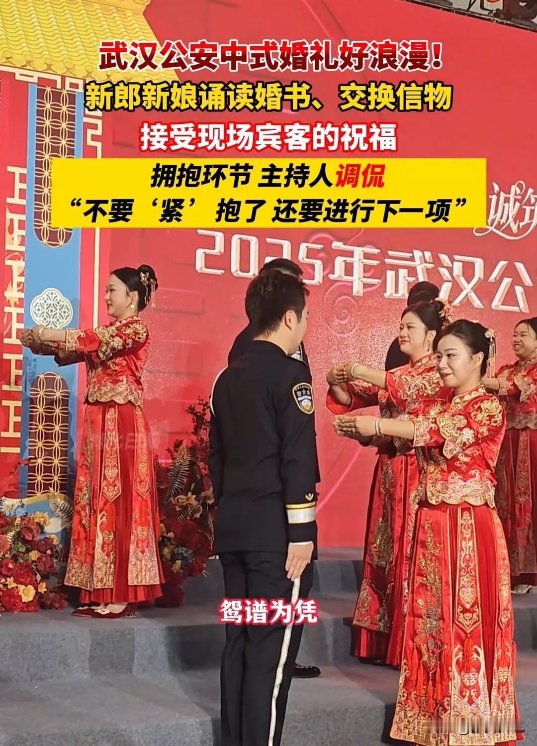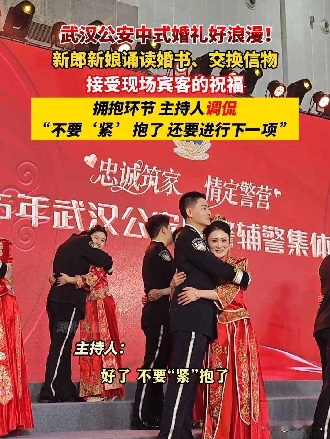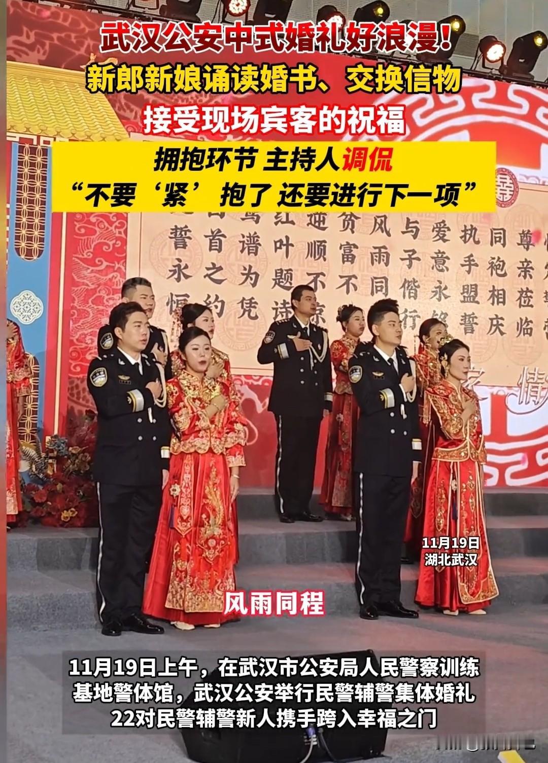 忠诚筑家,情定警营,在警营里办一场浪漫的集体婚礼会是什么样的情形呢? 近日,湖北武汉市公安局人民警察训练基地警体馆里,武汉公安为22对民辅警举办了一场浪漫的集体婚礼。22对民警、辅警新人一起携手跨入了幸福之门。 “风雨同程,贫富不移,逆顺不惊,红叶题诗,鸳谱为凭”,现场新郎新娘全体右手抚心,齐声诵读婚书,交换了爱情信物,并一起接受现场嘉宾的浓浓祝福。在拥抱环节,主持人调侃各位新郎新娘:不要抱得太紧了,还要进行下一项哟。 说实话,中式婚礼真的好浪漫呀,高端大气上档次,现场还展示了东风猛龙、龙式装甲车、豹式装甲车等各种特种车辆,给婚礼增添了庄严和浪漫的氛围。 这场婚礼是这22对新人幸福生活的起点,也是武汉公安对他们的关爱。集体婚礼