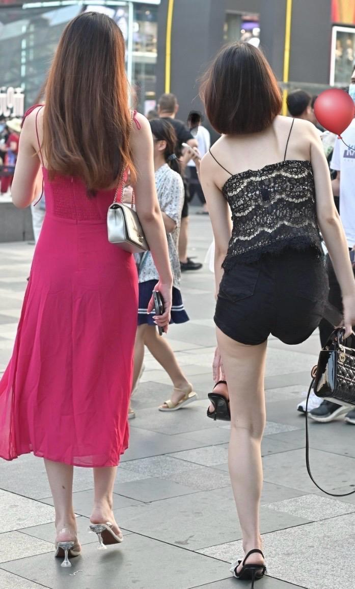 夏日街头,两位女子并肩而行,成为一道流动的风景。左边的她一袭玫红长裙,裙摆随着步伐轻摇,尽显温婉柔美;右边的她一身黑色吊带配热裤,利落又不失妩媚。