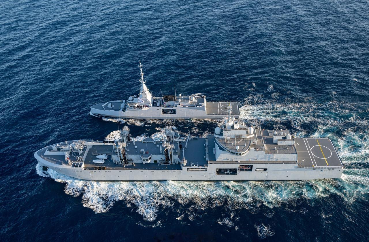 法国海军补给舰“雅克·斯托斯科普夫”号与护卫舰“罗纳尔海军上将”号首次进行海上补