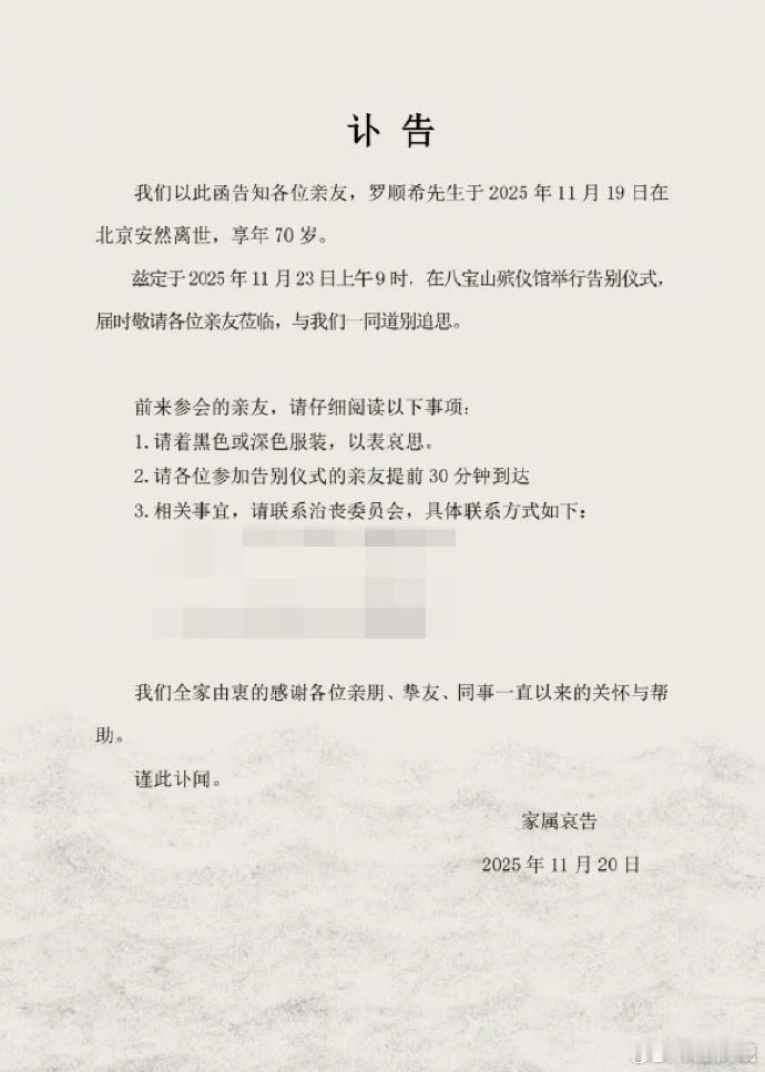 20 日, 的经纪人在朋友圈发布讣告,表示罗晋的父亲罗顺希先生于 11 月 19 日在北京安然离世,享年 70 岁。目前罗晋本人及家人正处于悲痛之中,全心处理各项事务。