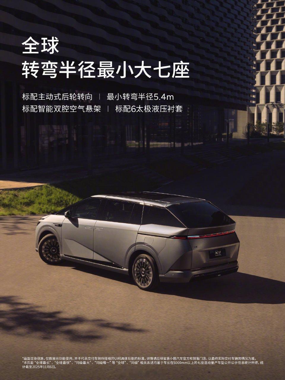 【452公里纯电续航,1602公里综合续航】让小鹏X9超级增程成为全球续航最长的大七座车型【63.3度超快充磷酸铁锂大电池10分钟就能充306公里】,不挑桩、不挑油,彻底告别排队充电的煎熬【同级最大的8892立方厘米前端吸能盒、全车标配同级最多的9个安全气囊】,在主动安全上,小鹏X9超级增程极限全场景爆胎都不会失控【130km/h的AEB紧急制动,以及130km/h的AES紧急避让】,让这辆车在冰雪天不甩尾、不跑偏、不失控【电动三折叠,第三排支持四六比例电动折叠和纯平收纳,2514L同级最大纯平储物空间】,一键即可灵活切换四人露营、五人骑行、六人携宠、七口之家等多种空间布局全球最长续航+超快充+全方位安全+百变空间,这波操作真的太顶了!小鹏X9超级增程上市发布会正在直播,一起来看小鹏X9如何玩转“下一代增程”!