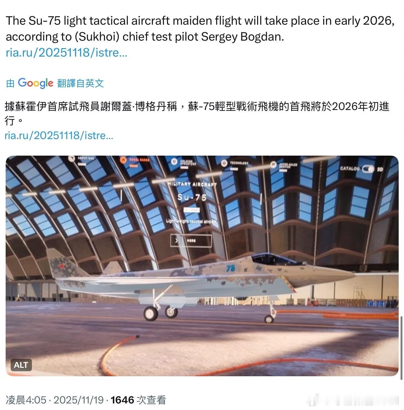 据苏霍伊首席试飞员博格丹称第五代战斗机苏75将在2026年初首飞,预祝成功。🍾️