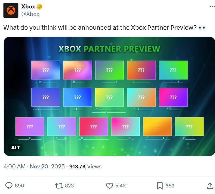 【Xbox明日发布会阵容猜想,官方提前预热】Xbox官方发布图文“你认为Xbox在凌晨的发布会上会宣布什么?”图片上每个预览框都留了个字母供玩家猜测。此前,Xbox公布了将于北京时间11月21日凌晨2点举办Xbox Partner Preview发布会,将会有一系列新公告和预告片。评论区有玩家评论道:“ 会宣布《007 初露锋芒》”、“如果明日《寂静岭 2 重制版》没有在Xbox上发布,我将把我的Xbox扔进垃圾桶。”、“可能又是Xbox GamePass价格上涨,因为那效果很好。”