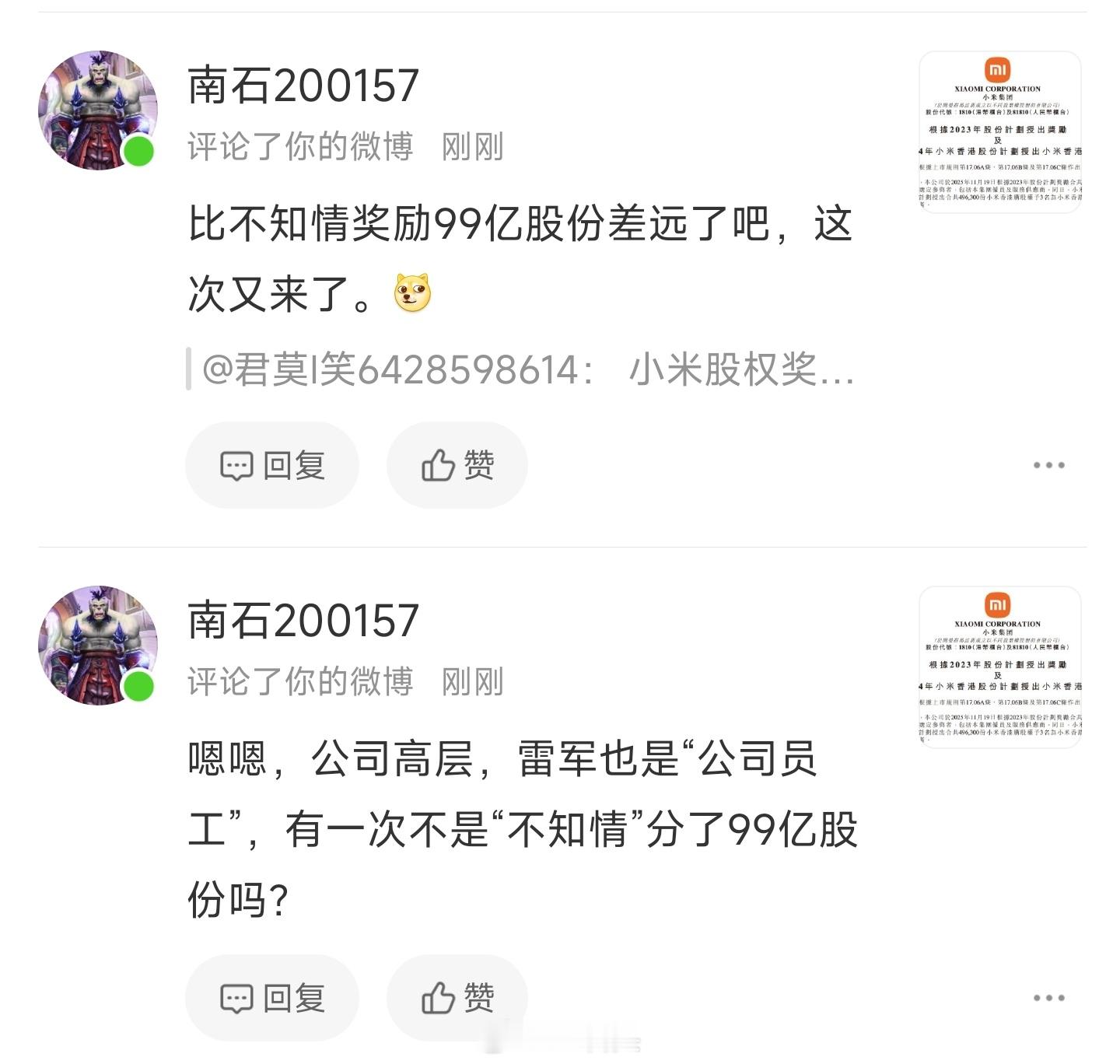 看给你们急得,雷军99亿分红这事儿,今天又拿出来岁月史书。你们要是能创办一个小米,你拿200亿都没人有意见,可惜你做不到。当然这也说明了一个事实,就是当别人只能翻旧账断章取义的时候,是真的没别的办法了。