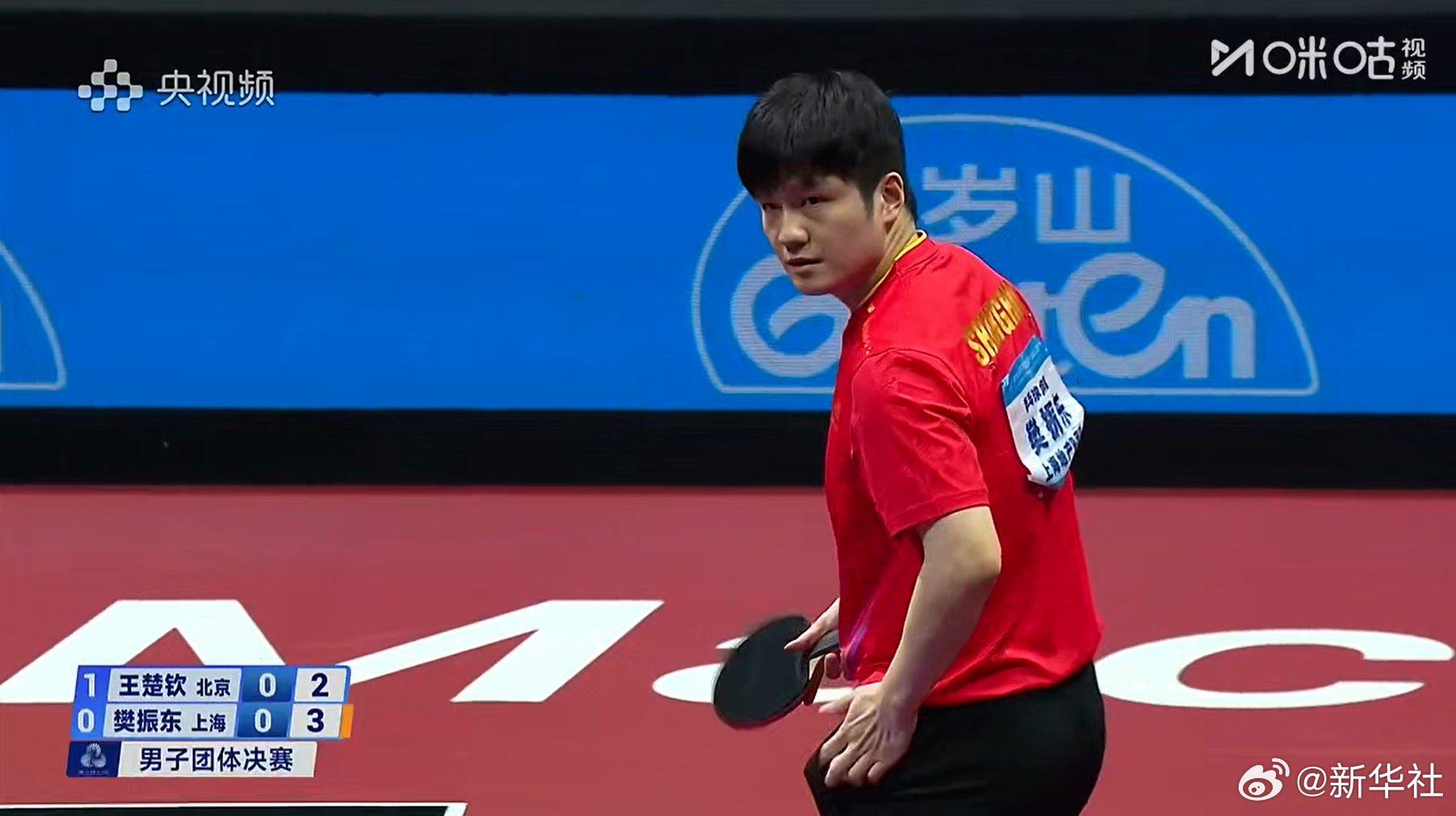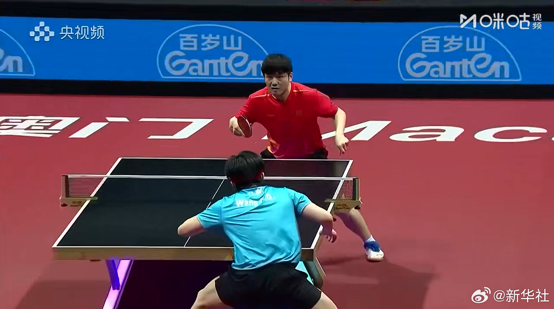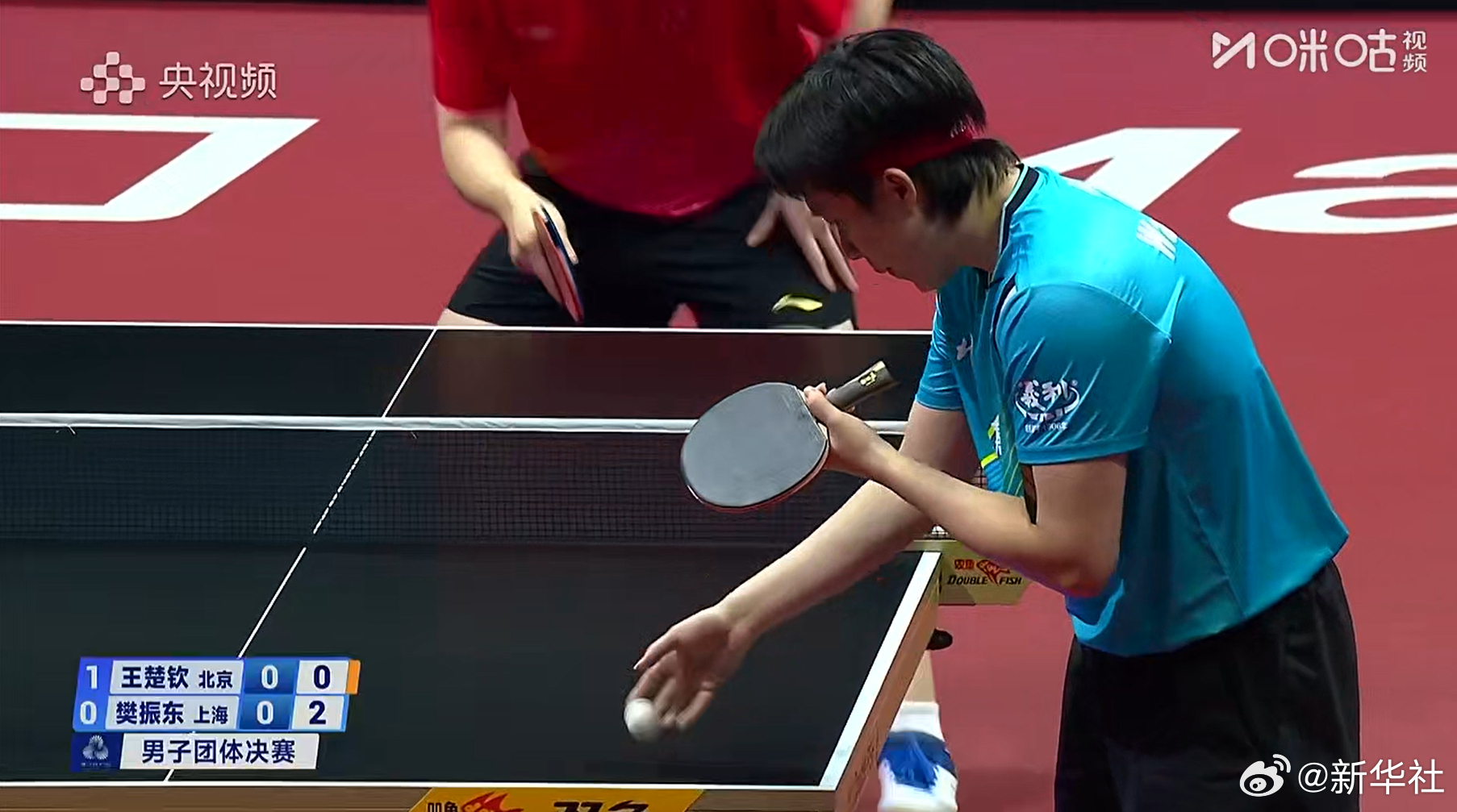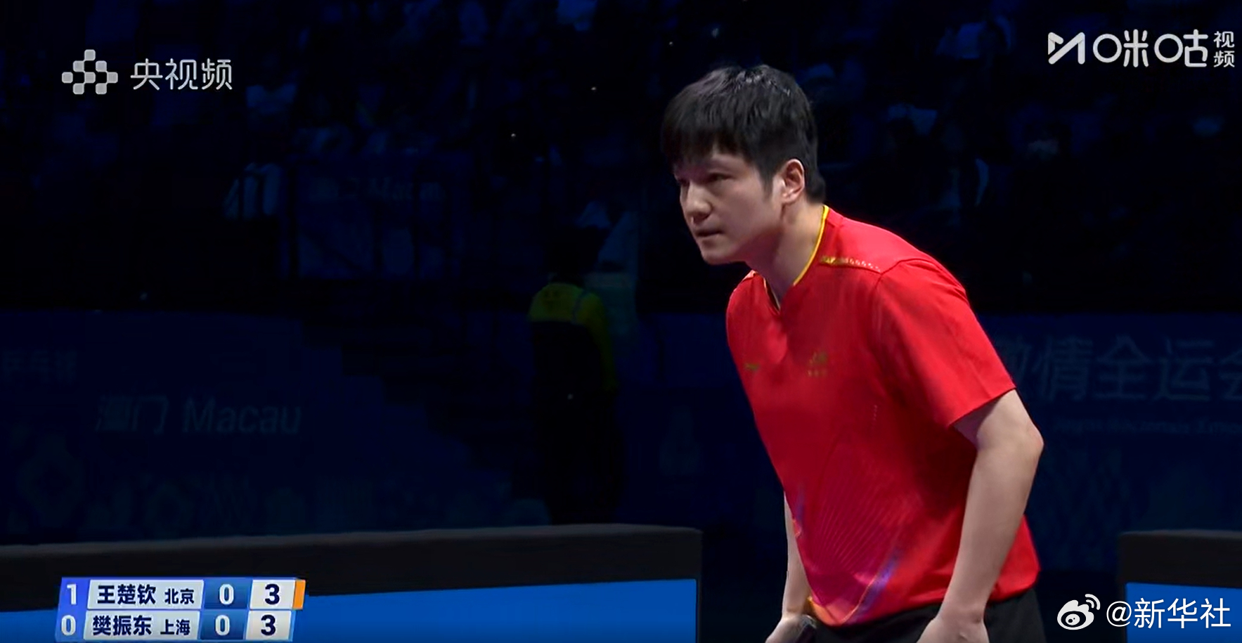 20日,第十五届全运会乒乓球男团决赛在澳门举行,北京队对阵上海队,第二盘比赛中, 与 再现单打对决,王楚钦拿下第一局。