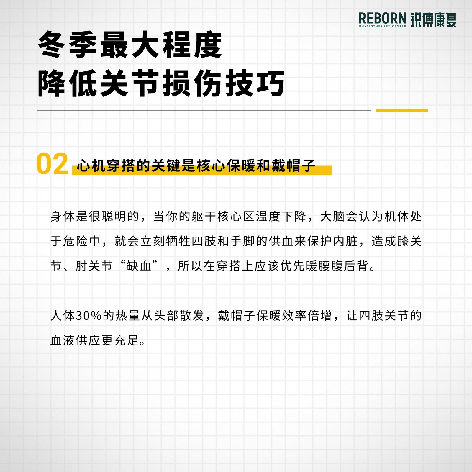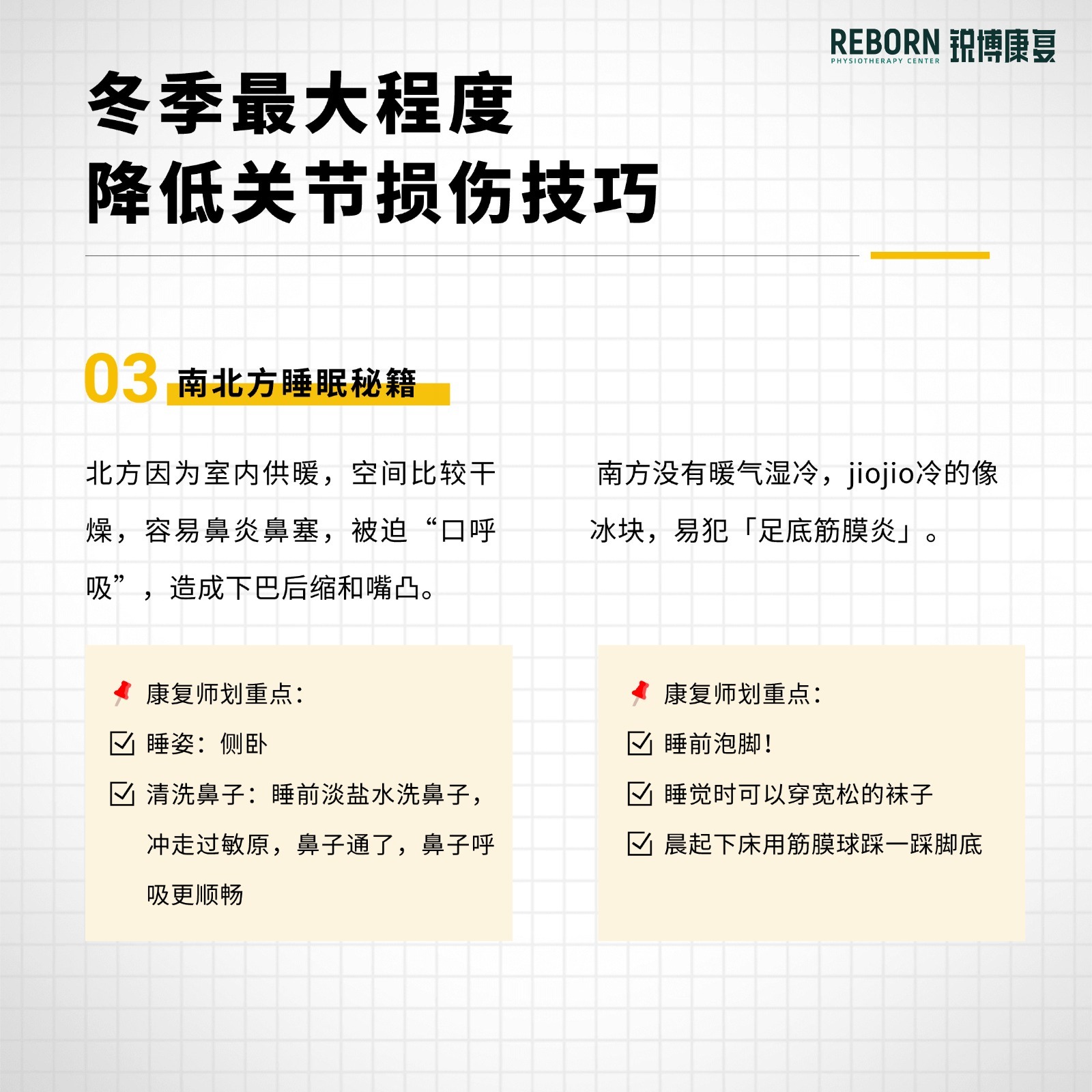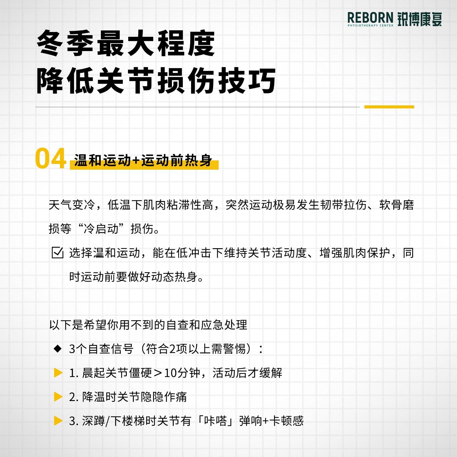 天气冷了,很多人觉得自己变得更“脆”了,今天帮大家整理一些生活技巧,其实这些看似日常的细节,真的有在保护你01. “泡澡”“泡脚”不是玄学,是科学。——冬季低温会直接导致血管收缩,流向四肢末端和关节滑膜的血液减少,致使关节僵硬、血液循环障碍与筋膜弹性下降。——温暖双脚,促进全身的血液循环,养分通过全身的血管直达关节,提升组织弹性,让关节更灵活。——化解一天下来的肌肉僵硬,尤其适合足底筋膜炎的朋友。✅划重点:✨ 水温:40°C左右✨ 时间:15-20分钟,微微出汗即可✨ 秘诀:水要没过脚踝,加到小腿肚02. 心机穿搭的关键是核心保暖和戴帽子。——身体是很聪明的,当你的躯干核心区温度下降,大脑会认为机体处于危险中,就会立刻牺牲四肢和手脚的供血来保护内脏,造成膝、肘“缺血”,所以在穿搭上应该优先暖腰腹后背。——人体30%的热量从头部散发,戴帽子保暖效率倍增,让四肢关节的血液供应更充足。03. 南北方睡眠秘籍。——北方因为室内供暖,空间比较干燥,容易鼻炎鼻塞,被迫“口呼吸”,造成下巴后缩和嘴凸。✅划重点:✨ 睡姿:更建议侧卧✨ 清洗鼻子:睡前淡盐水洗鼻子,冲走过敏原,鼻子通了,鼻子呼吸更顺畅——南方没有暖气湿冷,jiojio冷的像冰块,易犯「足底筋膜炎」。✅划重点:✨ 睡前泡脚✨ 睡觉时可以穿宽松的袜子✨ 晨起下床用筋膜球踩一踩脚底04. 温和运动+运动前热身——低温下肌肉粘滞性高,突然运动极易发生韧带拉伤、软骨磨损等“冷启动”损伤。✨选择温和运动,能在低冲击下维持关节活动度、增强肌肉保护,同时做好运动前的热身。以下是希望你用不到的自查和应急处理✅ 3个自查信号(符合2项以上需警惕):1. 晨起关节僵硬>10分钟,活动后才缓解2. 降温时关节隐隐作痛3. 深蹲/下楼梯时关节有「咔嗒」弹响+卡顿感
