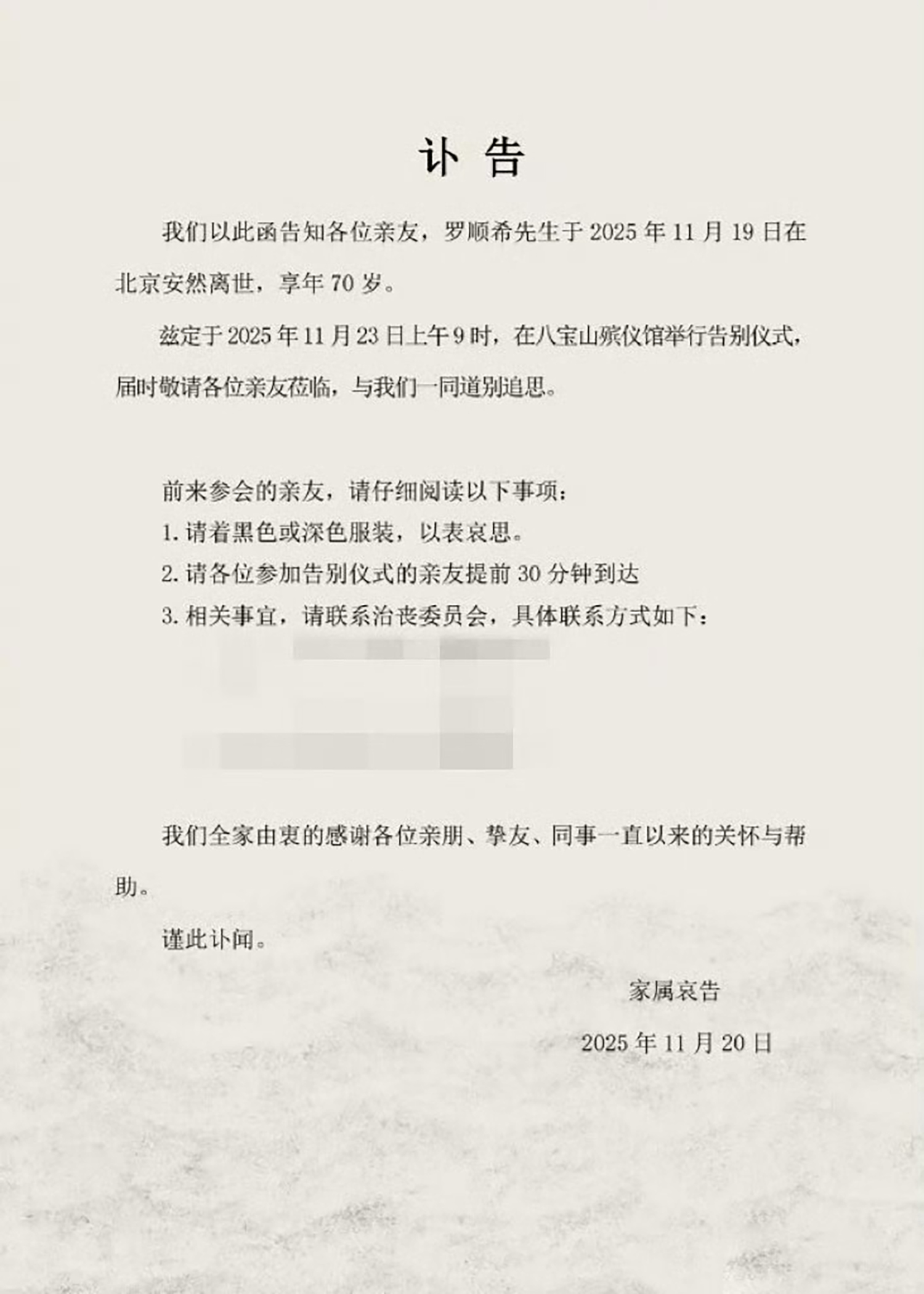 罗晋父亲讣告出现在热搜榜上。 11月19号罗父在北京去世,享年70岁。 平均寿命高达79岁的当下,罗父大概率是因病去世,讣告里说罗父安然离世,对家属而言也算是慰藉了。 罗晋是江西省宜春市铜鼓人,成名后定居北京,也把父母接到了身边,爸妈都是医务工作者,爸爸是外科医生,他从小就是闻着消毒水的味长大的。