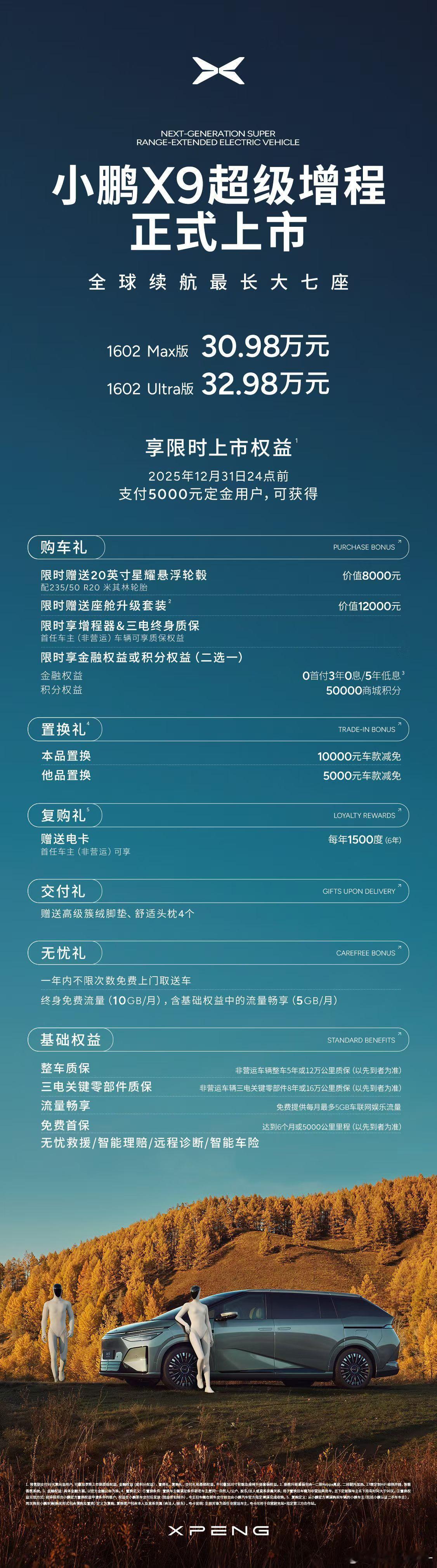 太炸了!!小鹏X9增程版最终售价,30.98万-32.98万元,比预售价直接拉低4万,这波诚意到位了!新车核心亮点就俩字——“全能”:搭载1.5T增程系统+63.3度电池,CLTC纯电续航452公里;综合续航直接干到1602公里。车内标配17.3英寸中控大屏+高通8295P芯片,二排双零重力座椅带21.4英寸娱乐屏,三排还能4/6分折放平更良心的是全系标配双腔空悬+CDC电磁减振和后轮转向,5.4米转弯半径让这5.3米大家伙灵活得像小车。800V平台配5C超充,10分钟补能313公里,看来小鹏这次是要在30万级MPV市场当“卷王”了!