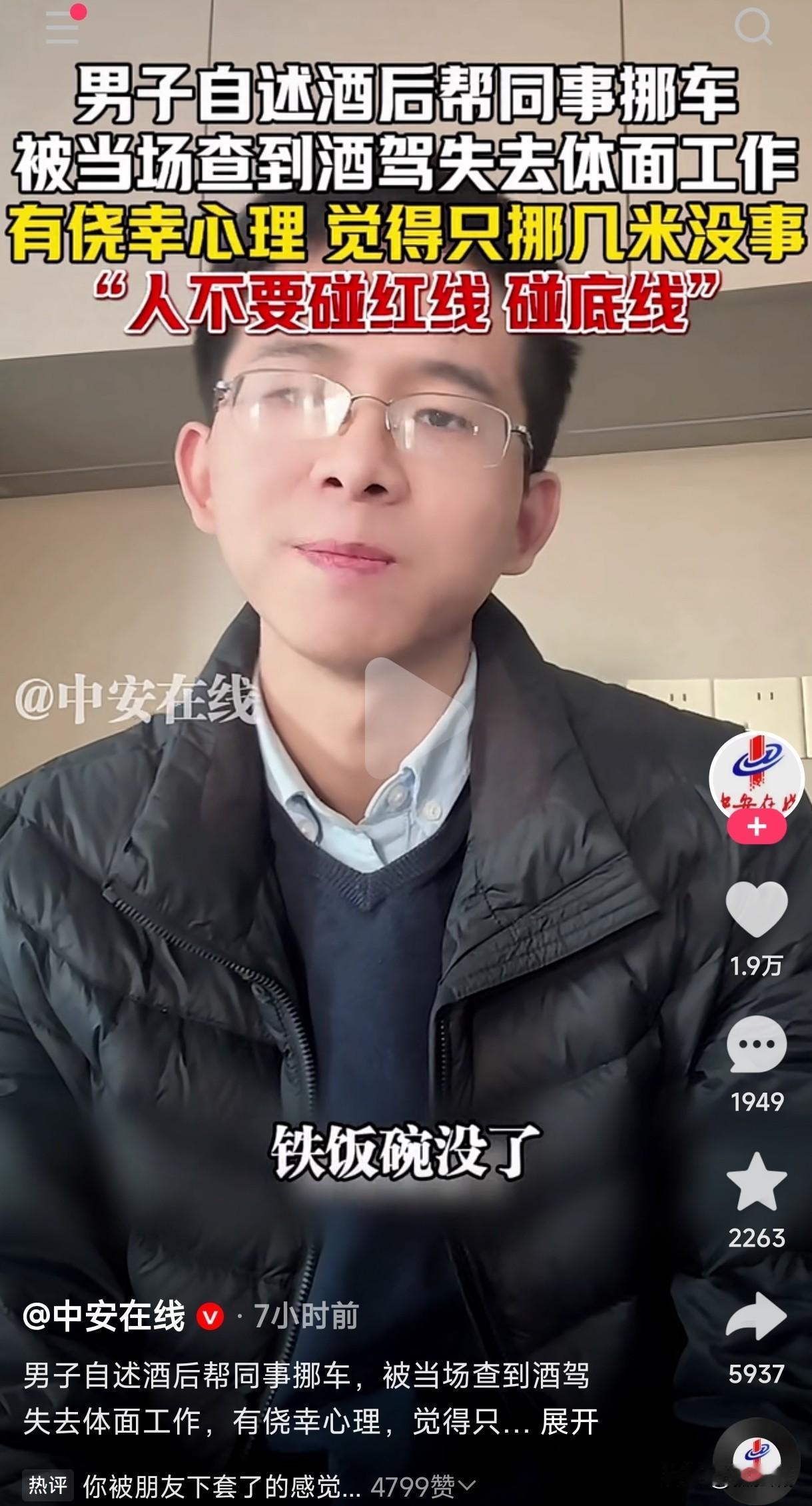 男子自述酒后帮同事挪车,被当场查到酒驾失去铁饭碗工作,他抱有侥幸心理,以为挪几米没事,然而却触碰了红线。 在日常生活聚餐中,想必这种事情有些人见到过,甚至有些人可能亲身经历过,以为只挪几米的距离会没事,谁能想到这几米的距离就是触碰了红线,触碰了底线,只要触碰红线和底线,必然就要受到应有的处罚,对于任何人都不会例外,不管是端铁饭碗的也罢,还是普通的平民也好,必受的处罚都是一样,俗话说喝酒不开车,开车不喝酒,不轮到任何时候都要谨记不能触碰红线,不能触碰底线。