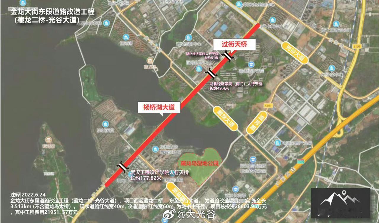 杨桥湖大道湖北经济学院人行天桥中标,150天 11月17日,从武汉市公共资源交易平台获悉,杨桥湖大道湖北经济学院人行天桥工程中标结果公布,武汉市江夏路桥工程有限公司以961.459966万元投标报价成功中标。目前项目现场已完成打围,预计工期150天,建成后将彻底改善该区域"人车混行"的交通现状,惠及周边数万师生及居民。 该项目拟新建杨桥湖大道湖北经济学院人行天桥一座。主桥全长 49.8m,桥面净宽4.0m,全宽5.1m。桥梁两侧分别设置1座钢梯道和1座钢坡道,梯坡道净宽2.4m,全宽2.8m。西侧梯道长 31.25m,坡道长104.4m。东侧梯道长16.5m,坡道长 104.4m。 据悉,藏龙岛主干道杨桥湖大道原为改造扩宽方案。22年6月,江夏区金龙大街东段道路改造工程(藏龙二桥-光谷大道)项目合同公告发布,项目西起藏龙二桥, 东至光谷大道, 为道路改造项目, 实施全长3.513km (不含藏龙岛大桥)。 现状道路红线宽40m, 改造道路 红线宽60m, 为城市主干路。项目总投资28803.96万元,其中工程费用21951. 57万元。沿杨桥湖大道由北向南依次规划3座过街人行天桥,分别是湖北经济学院人行天桥,湖北经济学院南门人行天街,武汉工程设计学院人行天桥。 从本次公示信息来看,应该仅是三座天桥中的一座,即湖经大门口的人行天桥,扩宽需再等待。杨桥湖堵主要原因是藏龙大桥只有双向四车道,高峰时堵在桥的两端十字路口。