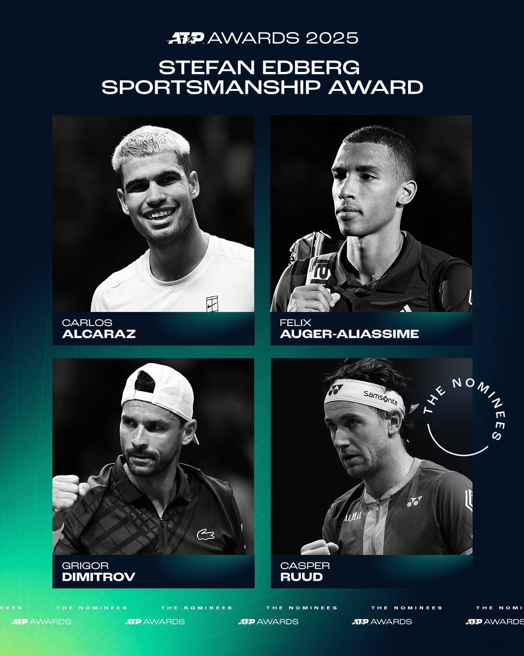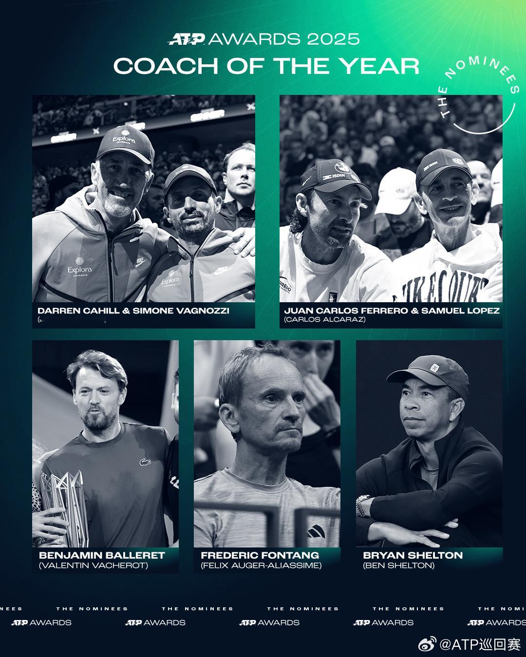 2025ATP年度奖项提名🌟🔵年度突破球员:德雷珀丰塞卡门希克瓦舍罗🔵年度最佳教练:卡希尔& 瓦格诺兹(辛纳)费雷罗&塞缪尔·洛佩兹(阿尔卡拉斯)巴勒雷(瓦舍罗)冯唐(阿利亚西姆)布莱恩·谢尔顿(本·谢尔顿)🔵 斯蒂芬·埃德伯格体育风尚大奖:阿尔卡拉斯阿利亚西姆迪米特洛夫鲁德