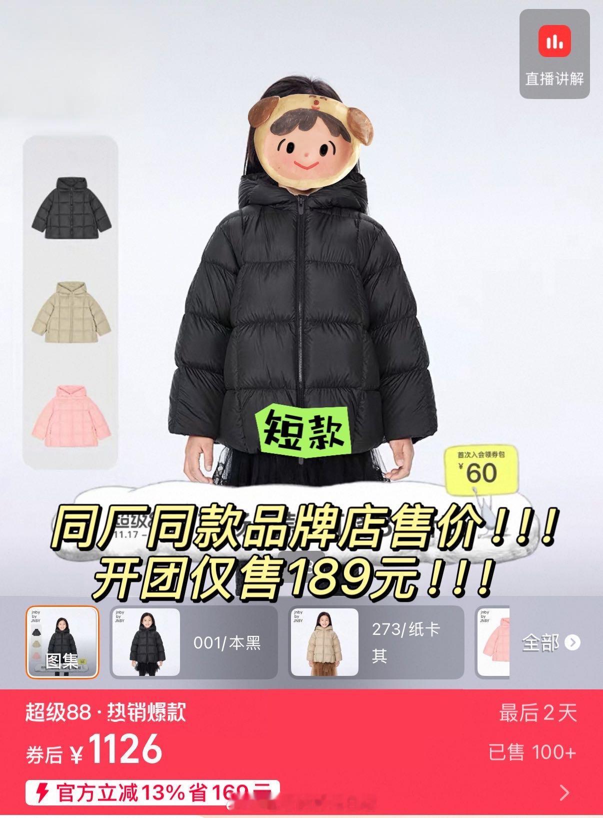 晚上好,开个儿童羽绒服团哈穿一件,顶三件,超暖和的高端儿童羽绒服。J*BY(江某布衣)代工厂直发,专柜1000多的羽绒服,同款只要100多一件。正儿八经的代工厂,新国标90%白鸭绒填充,少了品牌标,直接便宜了1000多。其实孩子长得快,牌子没那么重要,只要是品质相同的衣服,缺个标没啥的。有长款和短款,长款专柜1700多,开团199!短款专柜1100多,开团189!衣服很厚实很保暖,有这一件,冬天足够了,性价比很高!注意,没有标哈!代工厂直发,前不久谈的合作。赠送运费险,放心买,放心试。