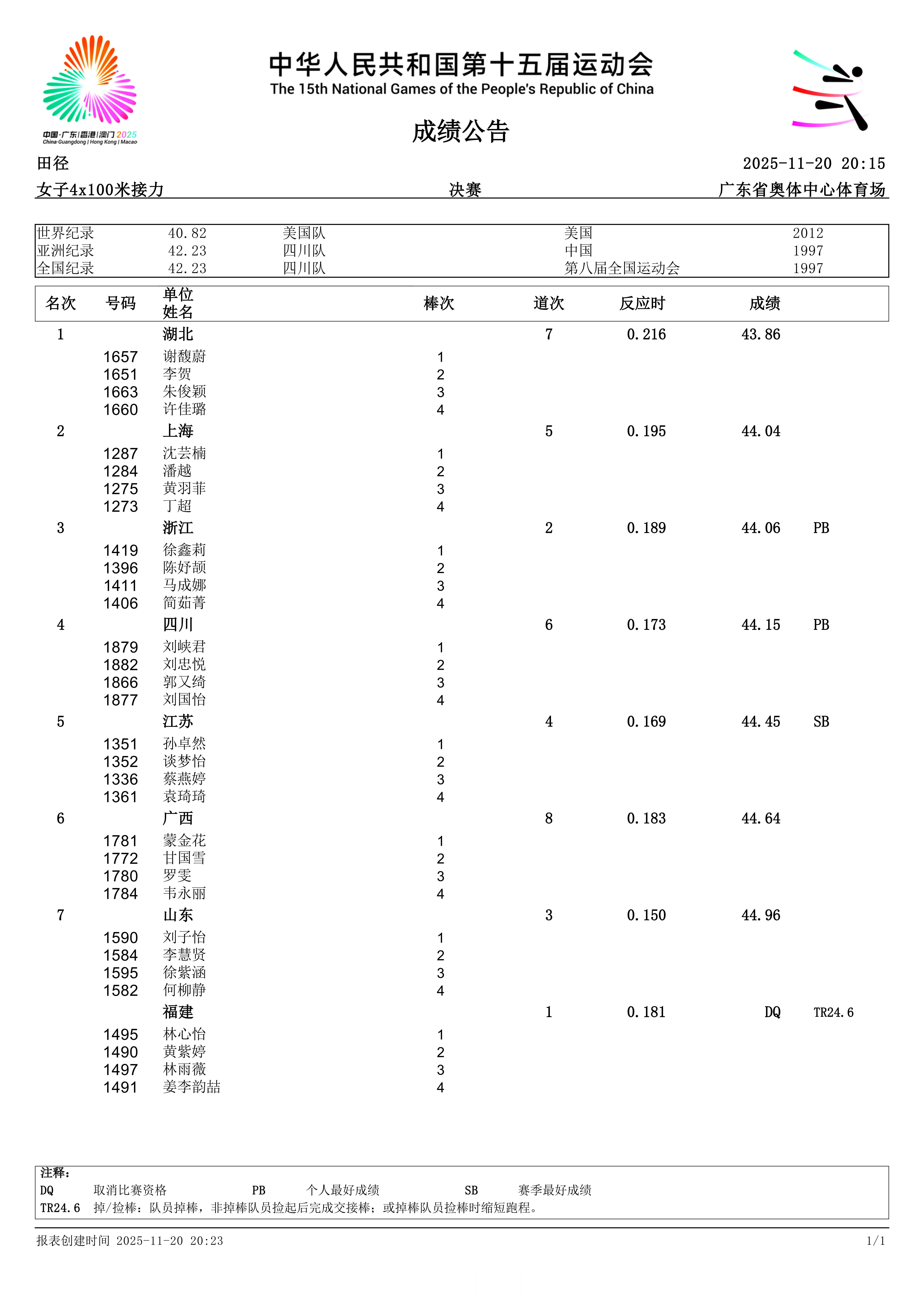 2025第十五届全运会女子4x100米接力。1、湖北 43.862、上海 44.043、浙江 44.06 PB(L踩线)福建 DQ(TR24.6 掉棒)