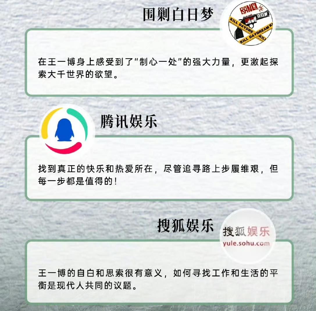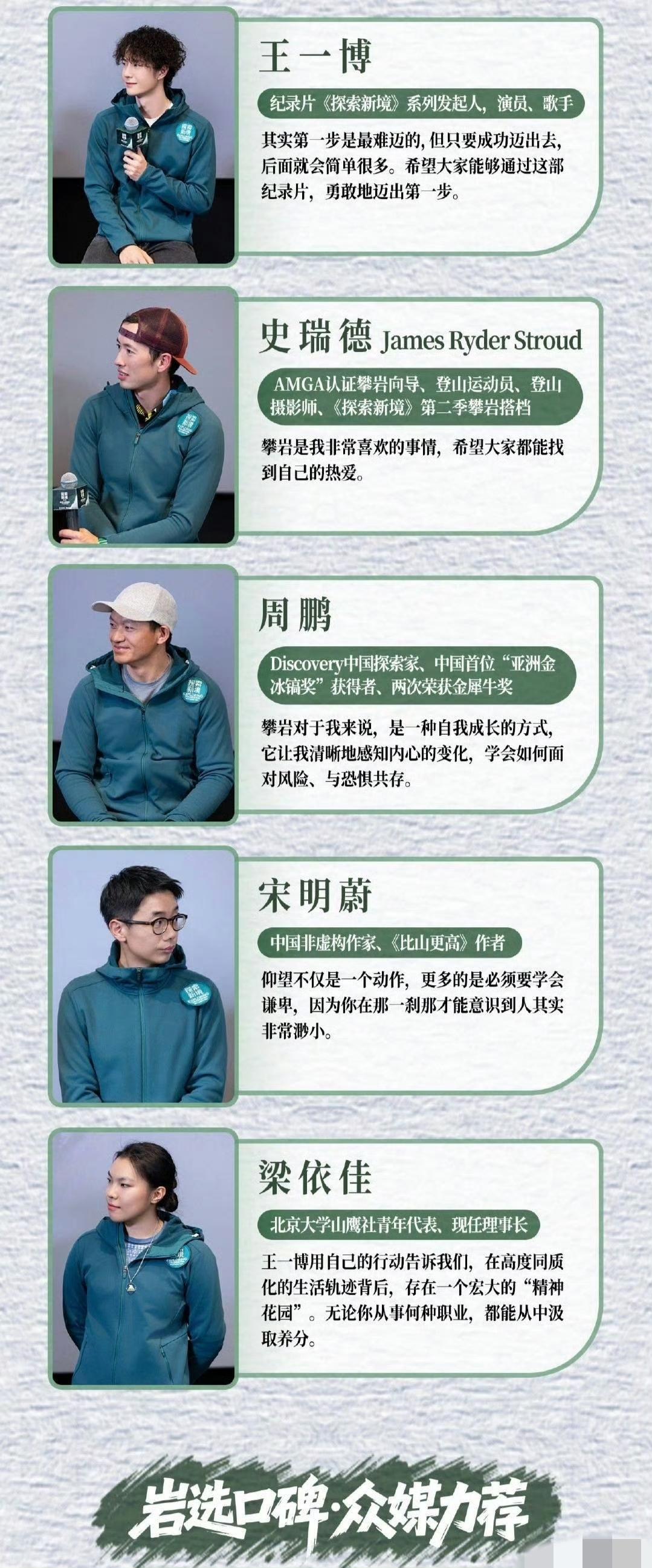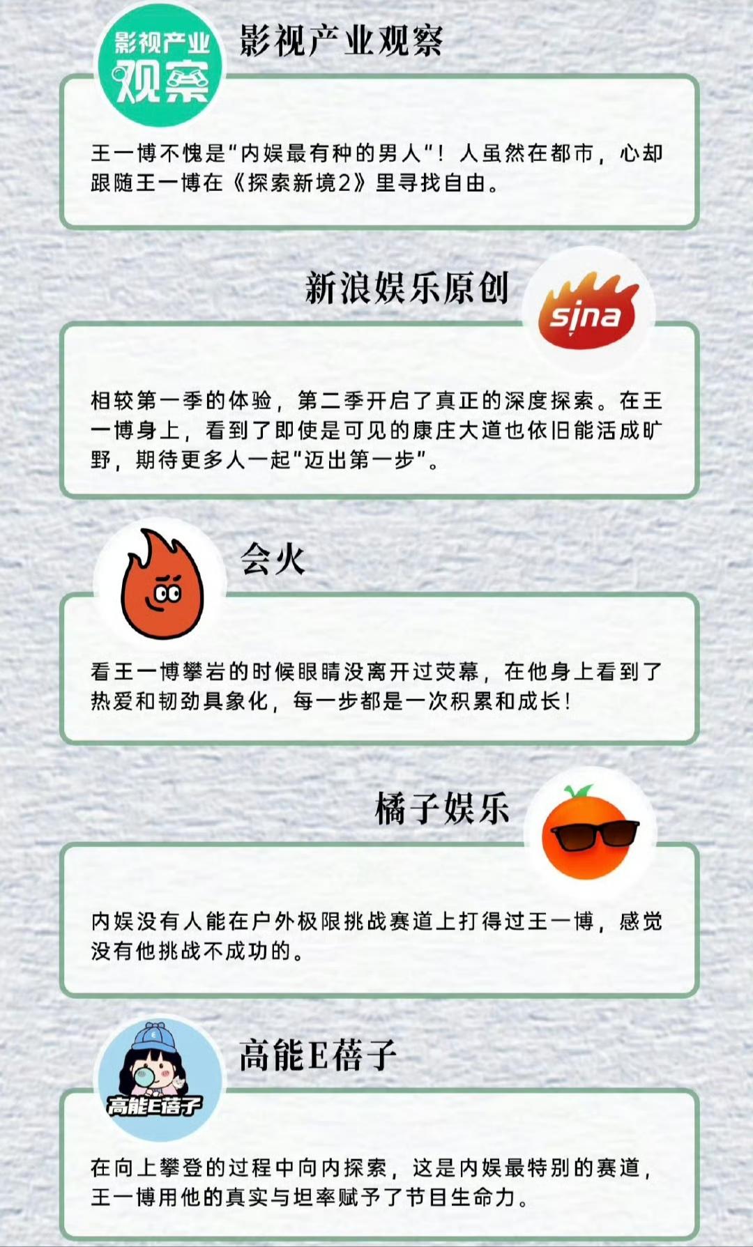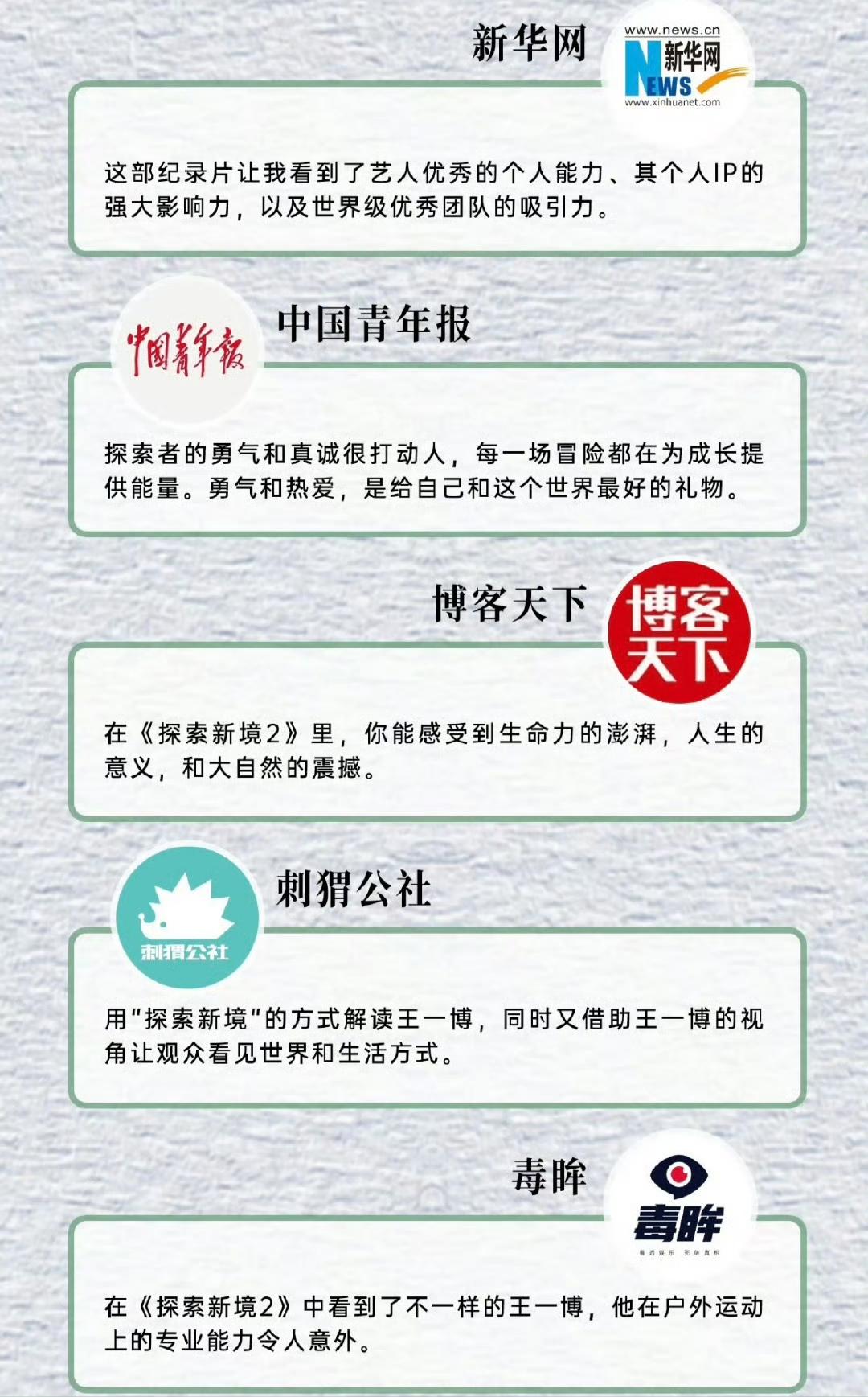 “我在努力活出生命的极致”,演员、歌手同时又作为《探索新境》系列发起人的王一博,可以说开启了内娱独一无二的赛道 ,迄今为止无人可及也复制不了。 而多家媒体、自媒体看了《探索新境2》首映会后,众口一词都给予了王一博和他的《探索新境2》高度评价。 💚“这部纪录片让我看到了艺人优秀的个人能力、其个人IP的强大影响力,以及世界级优秀团队的吸引力。” 💚“探索新境,也是探索“心"境”“ 💚“在节目里看见了王一博一往无前的勇气和始终如一的专注力,他用行动践行对自由与旷野的追求。” 💚“他在户外运动上的专业能力令人意外。” 💚“内娱没有人能在户外极限挑战赛道上打得过王一博,感觉没有他挑战不成功的。” 💚“在向上攀登的过程中向内探索,这是内娱最特别的赛道,王一博用他的真实与坦率赋予了节目生命力” 💚“王一博不愧是“内娱最有种的男人"!” 其实毫不夸张的说,只要真正不带偏见的去看王一博这个人,去了解他、正视他,基本上没有人会不喜欢这个人品贵重天赋过人,热烈的自由的无比真诚真实的去一往直前地追寻自我的年轻人。 王一博