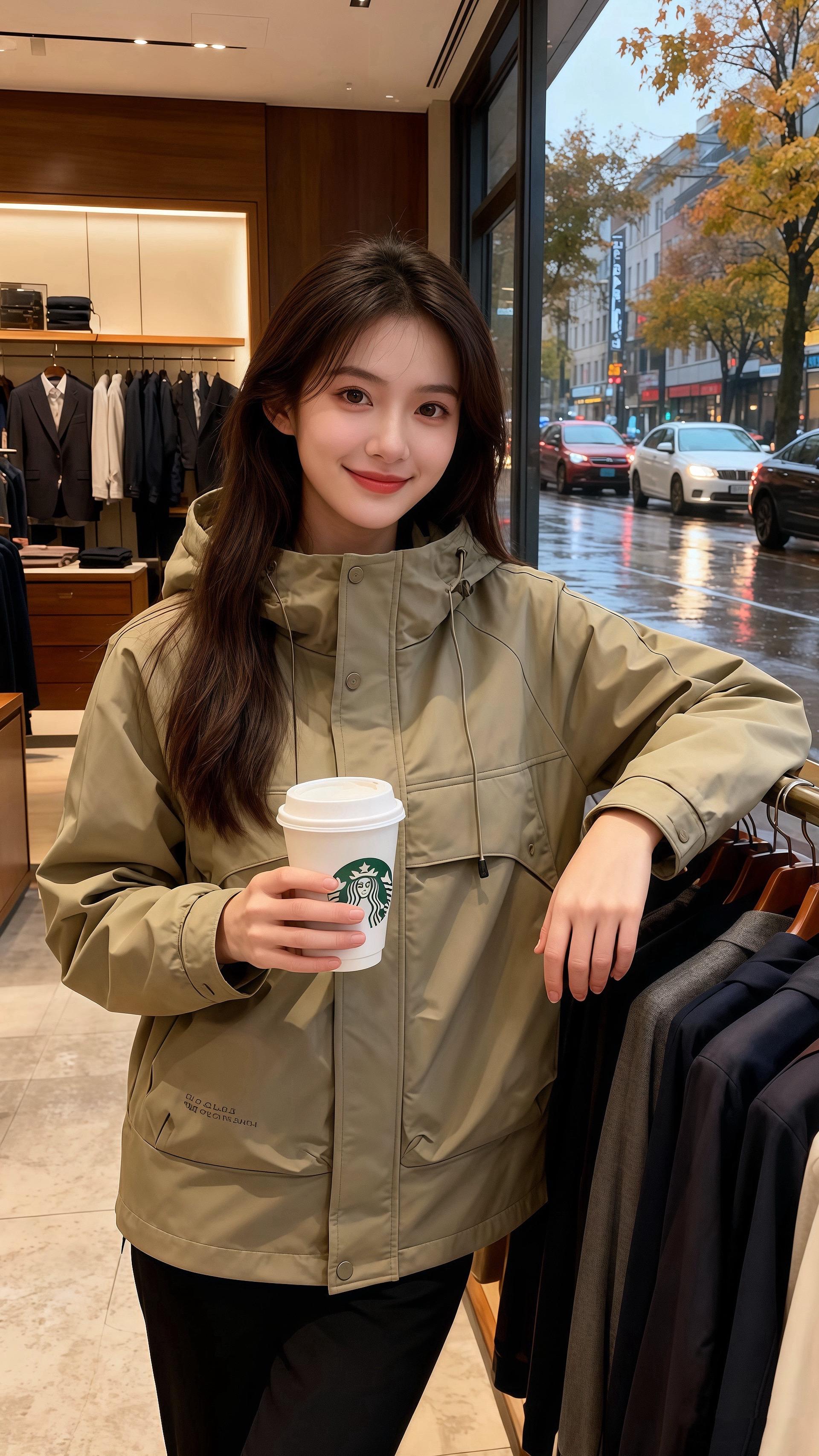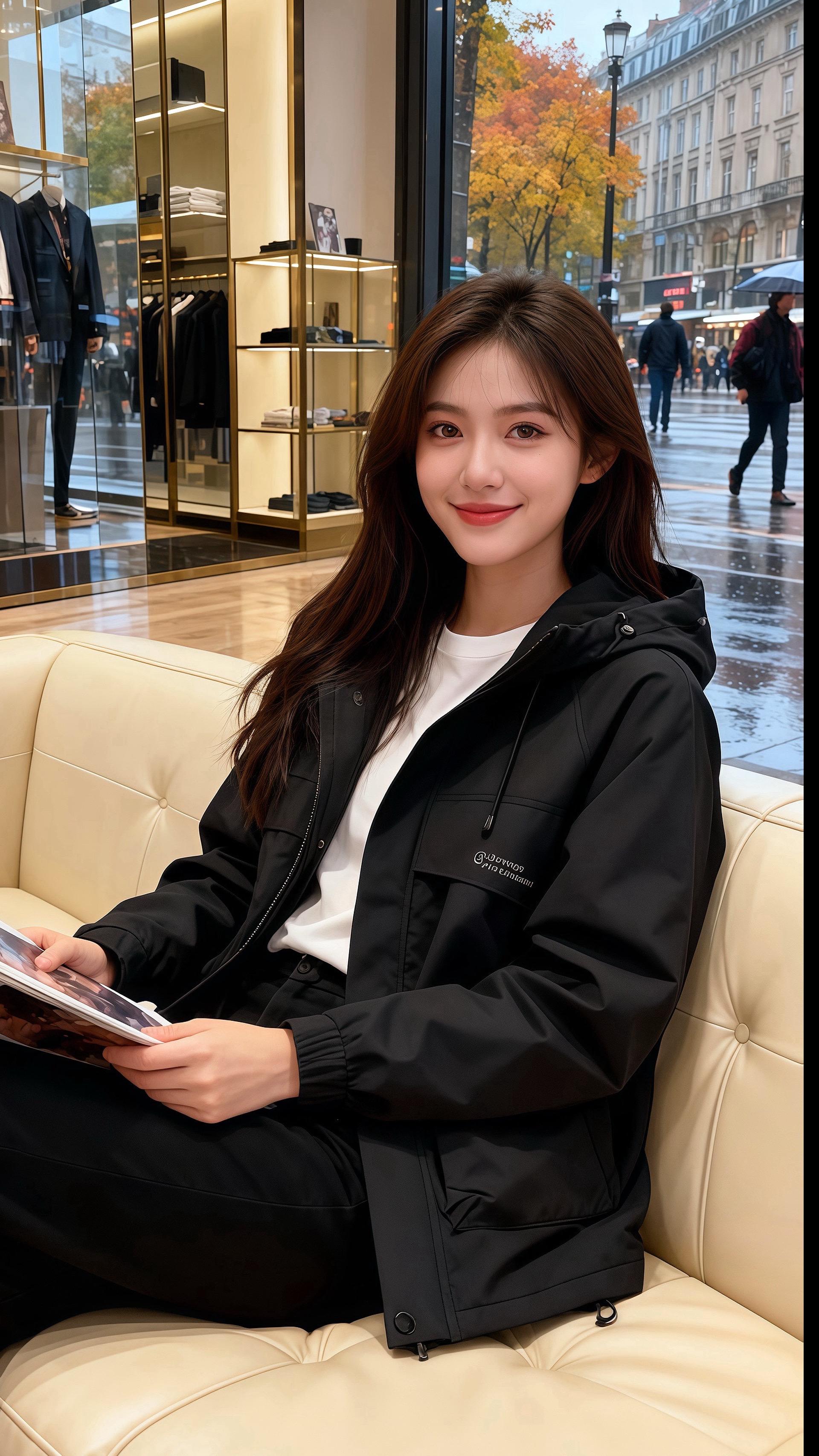 秋雨裹着桂香漫进橱窗时,许妍正指尖划过杂志页,卡其色外套的兜帽垂在肩后,像揉皱的月光。