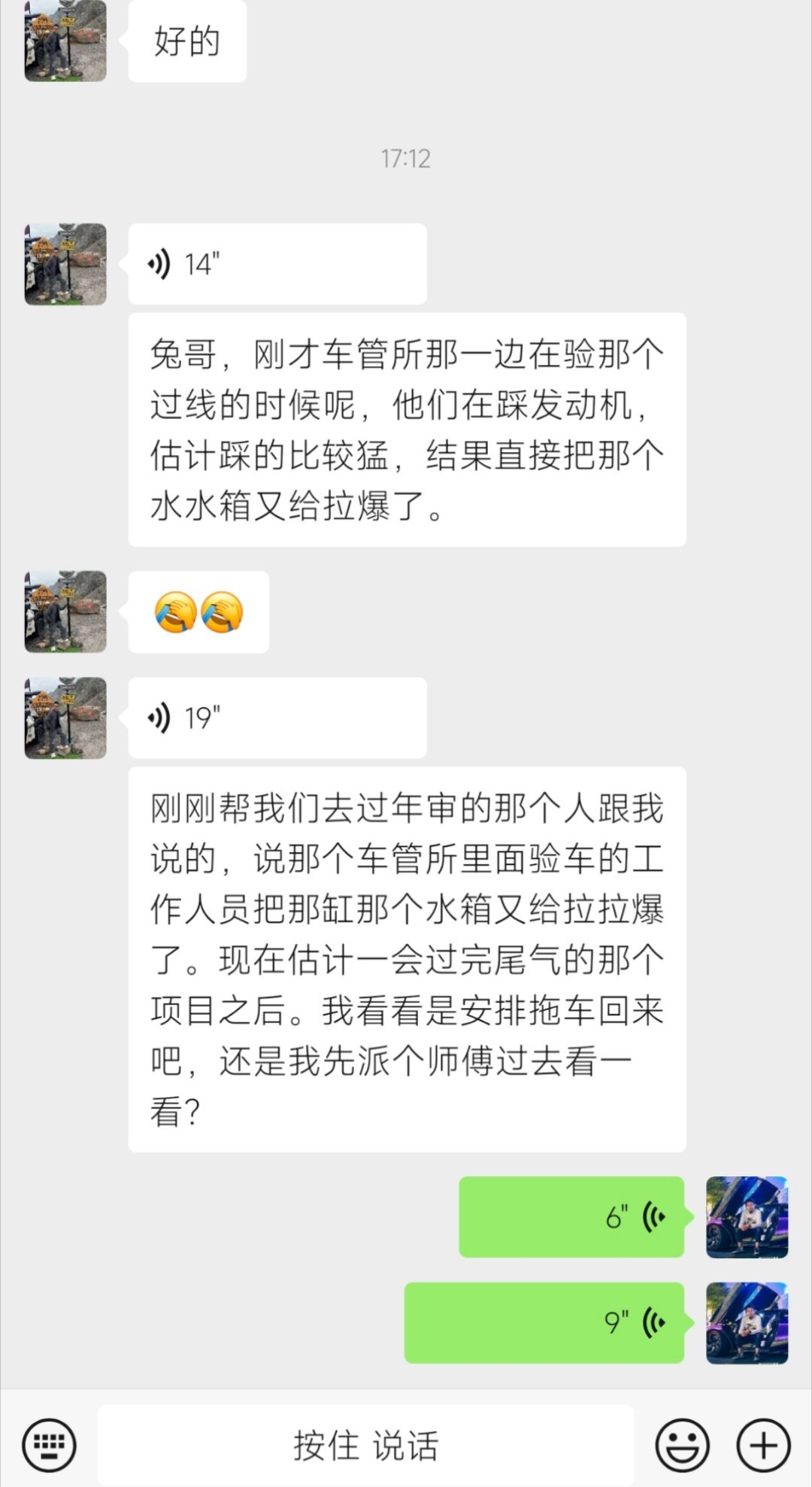我tmd人麻了!!众所周知,我的草原狼住院了半年,让水泡了……前不久说修好了,我让店里开去年检,结果去年检的路上,水箱爆了……拖回店里找配件,又修了1个多月,终于修好了,我让店里开去年检,这次到到了检测站,上线检验的时候,师傅把车水箱又踩爆了……tmd!!!