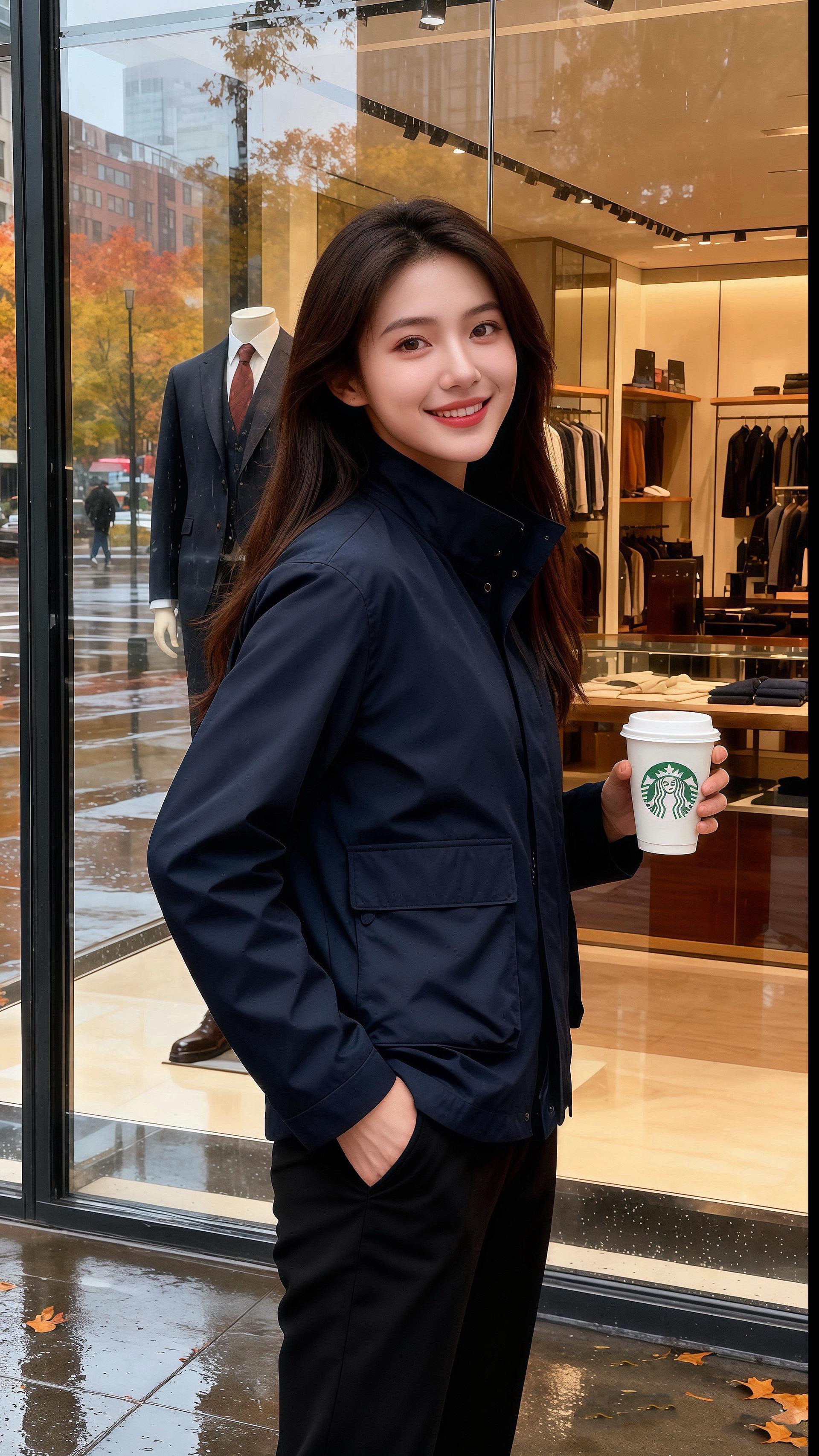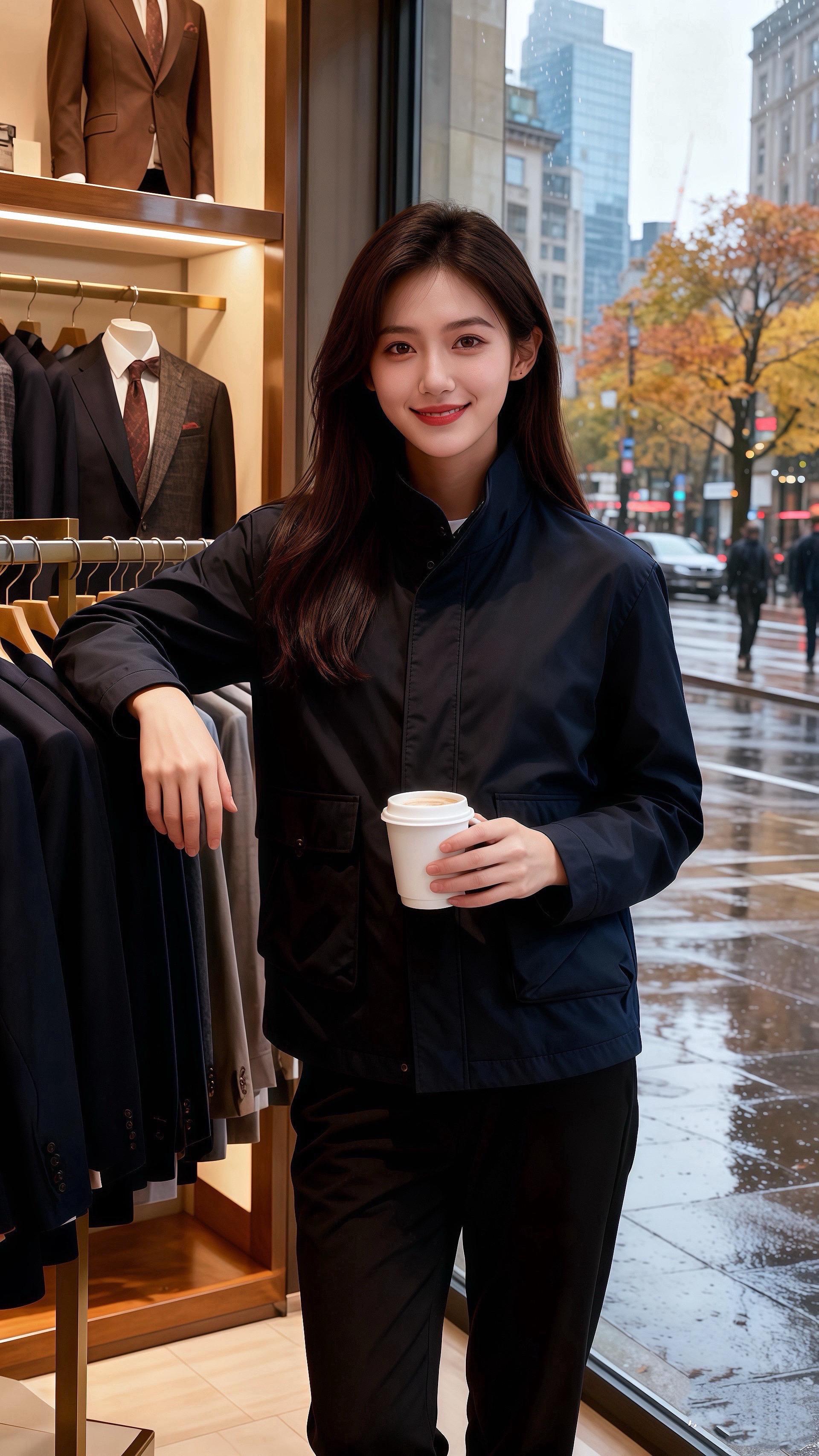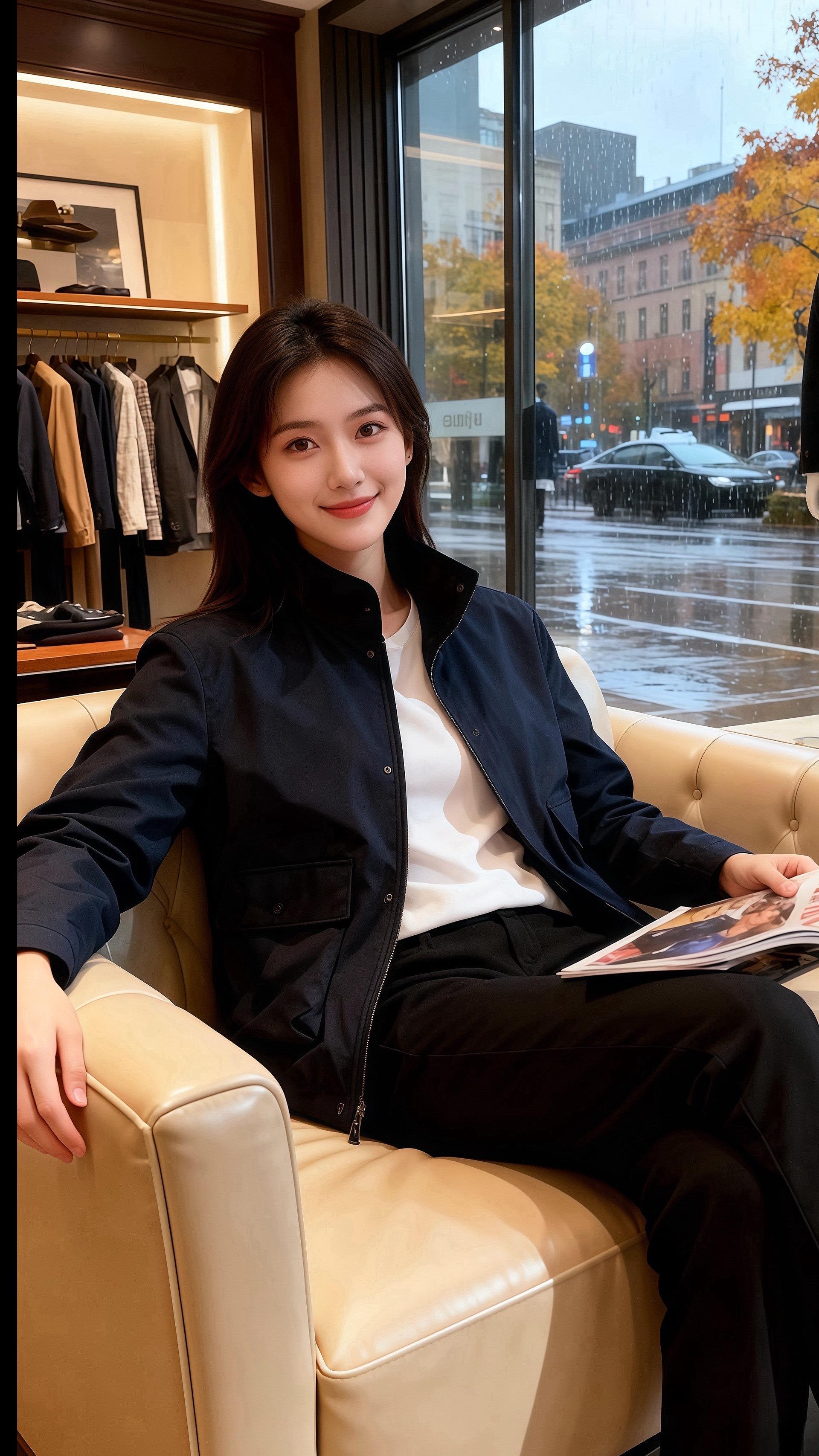 《雨街夹克》 秋雨裹着桂香漫过街面,许妍立在橱窗前,藏青夹克的口袋松松垮垮揣着半只手,咖啡杯沿的白汽沾了她发梢。 皓明刚停好车,撑伞走近时,正撞见她指尖划过夹克的口袋缝线——利落的立领衬得她下颌线软,黑裤裹着脚踝,像把秋凉都揉成了松弛的好看。 “上周见你穿这件,比橱窗里的西装顺眼。”他把伞偏过去半柄,雨珠落在她夹克肩线,“像把秋天揣在了身上。” 许妍抬眼笑,咖啡的暖香裹着雨气:“那你要不要揣进我口袋里?”
