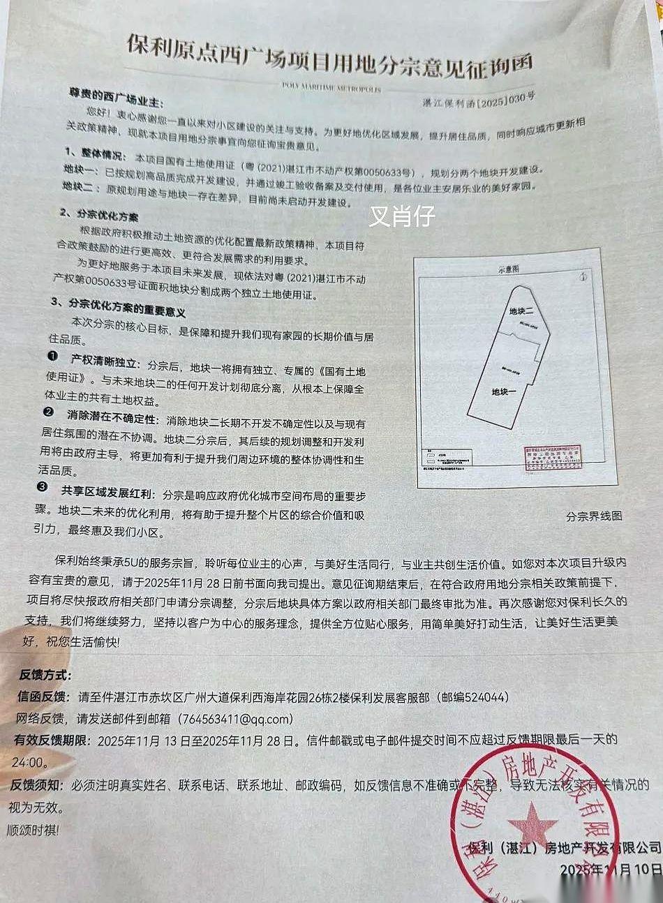 “土地分宗”。 听着是不是特专业,特高大上? 翻译成人话就是:你买房时,开发商指着沙盘上那个流光溢彩的大广场,说得天花乱坠的配套,现在可能要黄了。 湛江那个保利海上大都汇,就来了这么一出。 说辞永远伟光正,为了“保障业主权益”,为了“项目顺利推进”。 我每次听到这种冠冕堂皇的话,就忍不住想笑,笑里带着凉意。 真的,成年人世界里,最需要翻译的就是这些“官方辞令”。 什么叫“保障权益”?就是先把那块本来答应你的地给切出去,至于以后是盖个别的,还是直接卖掉,那叫“后续灵活调整”。 什么叫“顺利推进”?就是先把能卖钱的住宅盖完,把钱收了,至于那些花钱又赚不了多少的配套,能拖就拖,能改就改。 最骚的操作,就是用一个看似为你好的理由,干一件对你最不利的事。 想想看,当初买房的时候,买的是什么? 不就是买个预期,买个对未来生活的想象吗? 你以为你买的是家楼下的中央公园、繁华商业街、孩子的嬉戏乐园……结果最后发现,你可能只买了个水泥盒子。 画饼的时候,你是上帝;要兑现了,你就成了“需被保障和安抚的群体”。 这套路,不新鲜。 但每次看到,还是觉得扎心。 因为那张可能被改掉的规划图背后,是无数个家庭,压上几代人的积蓄和对未来的全部憧憬啊。