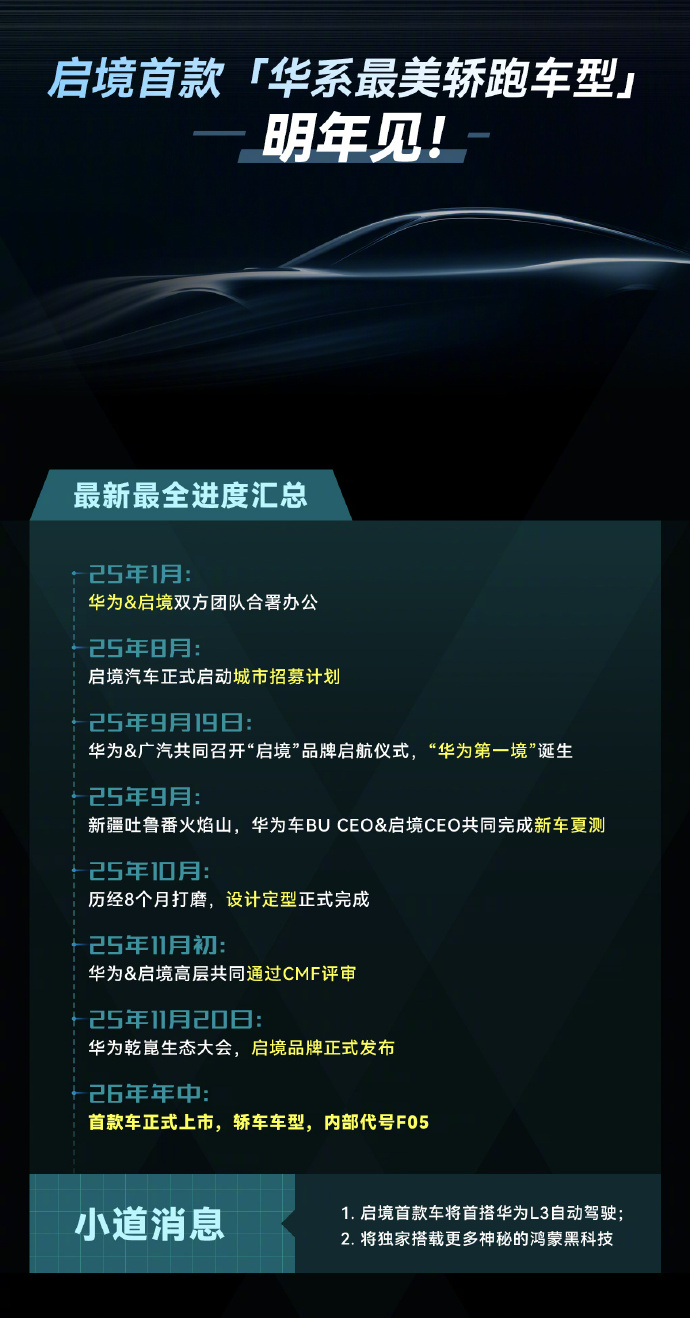 想在智能驾驶领域搞出大动静?启境和华为乾崑就干了件大事。在11月20日的生态大会上,启境CEO刘嘉铭宣布,华系首款猎装轿跑明年6月交付。这车直接搭载华为乾崑智能全家桶,起步就是L3级架构,启境成了首个落地该智能驾驶方案的品牌。华为对启境相当看重,给全栈技术支持。双方合作注重技术与制造经验融合,新车备受关注,你觉得这会给行业带来啥改变?