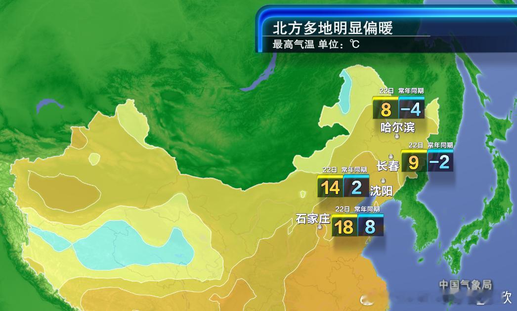 【气温冲高回落 起伏加大】未来2天我国大部地区的气温还会上升。北方多地在22日气温达到近期高点,南方气温高点在23日或24日。22日东北华北多地最高气温将比常年同期偏高10-12℃,比如哈尔滨、长春、沈阳、石家庄。23-25日将有一股较强冷空气自西向东影响我国大部地区,导致北方出现6~8℃、南方出现4~6℃降温,北方局地降温可达10~12℃。而且26日以后,还有冷空气活动。因此周末到下周的气温,起伏变化节奏很快,小心感冒。