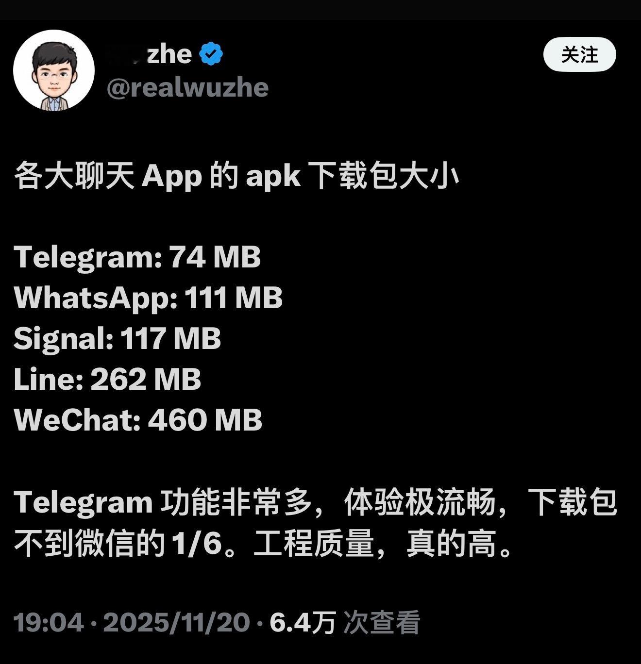 说两点吧:1️⃣很多iPhone用户在256和512之间犹豫最后选512不是因为自己要拍照,而是考虑到微信很占内存……2️⃣电报不知道用了啥技术,即便攒了几千条群组信息也可以秒开,加载时间非常短,但几百条微信消息点开先卡5秒。