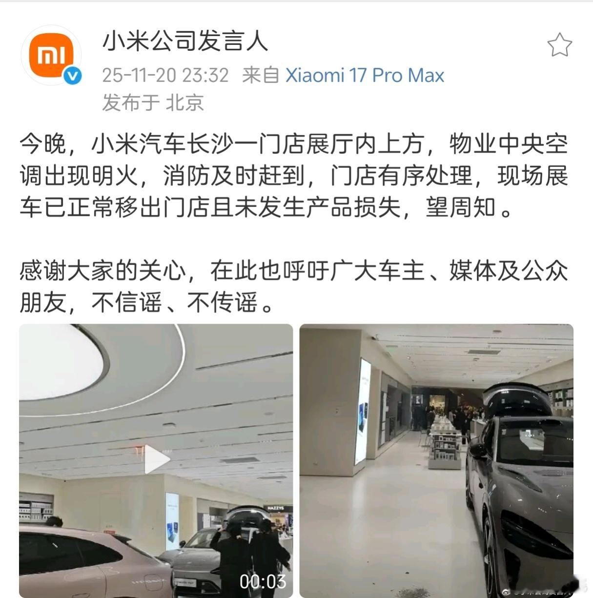 网传小米长沙一门店展车自燃,小米公司迅速回应,是物业的中央空调自燃。人红是非多呀