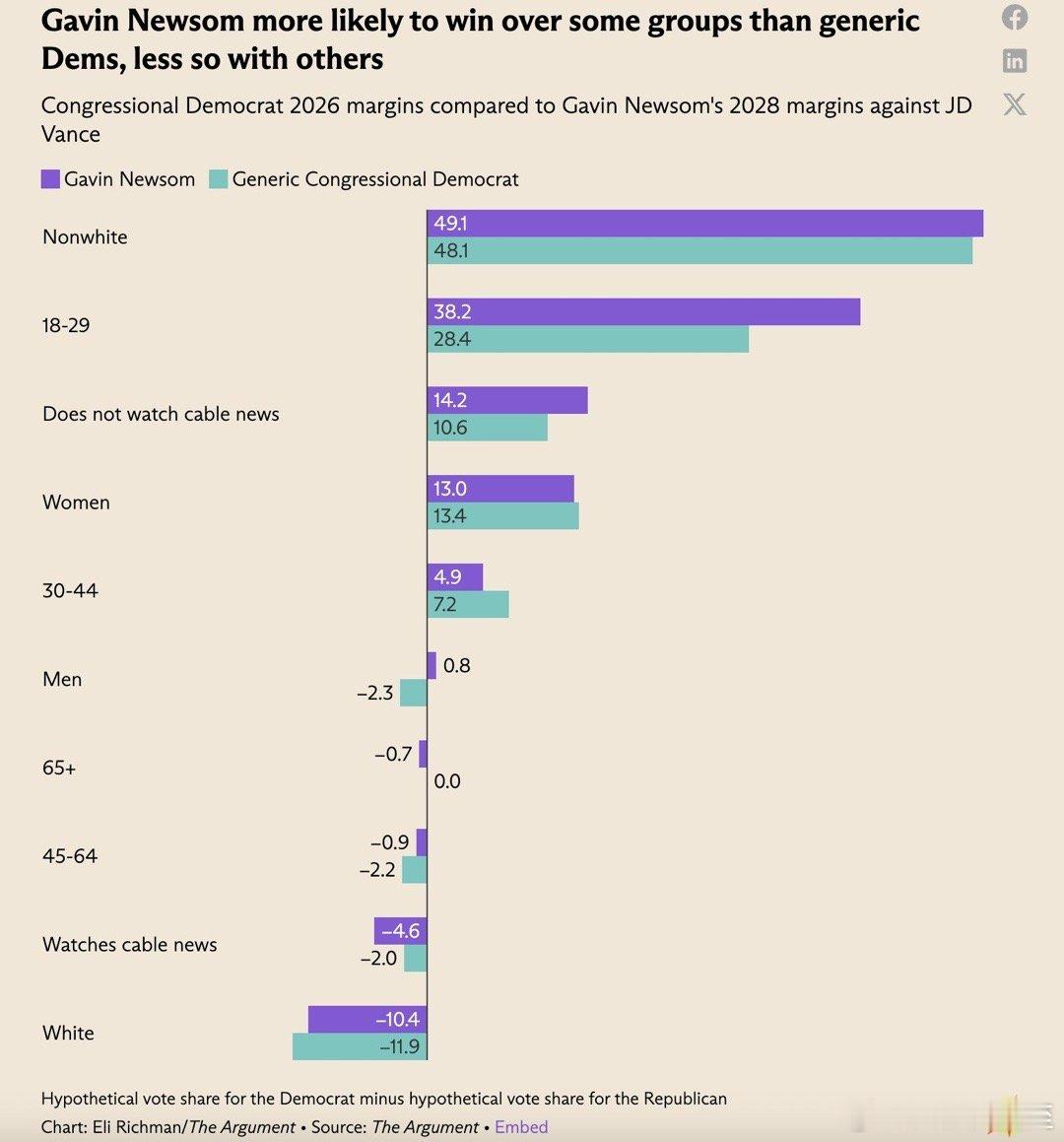 2028假设Newsom 🆚 Vance,加州州长领先副总统更有意义的信息是:相比其他民主党政客,他的优势在非白人、年轻人、不看电视新闻的人;劣势在65岁以上、看电视新闻的人Newsom 现在的策略是对的,要继续在网络上,更高调反川,争取少数裔、年轻人的支持