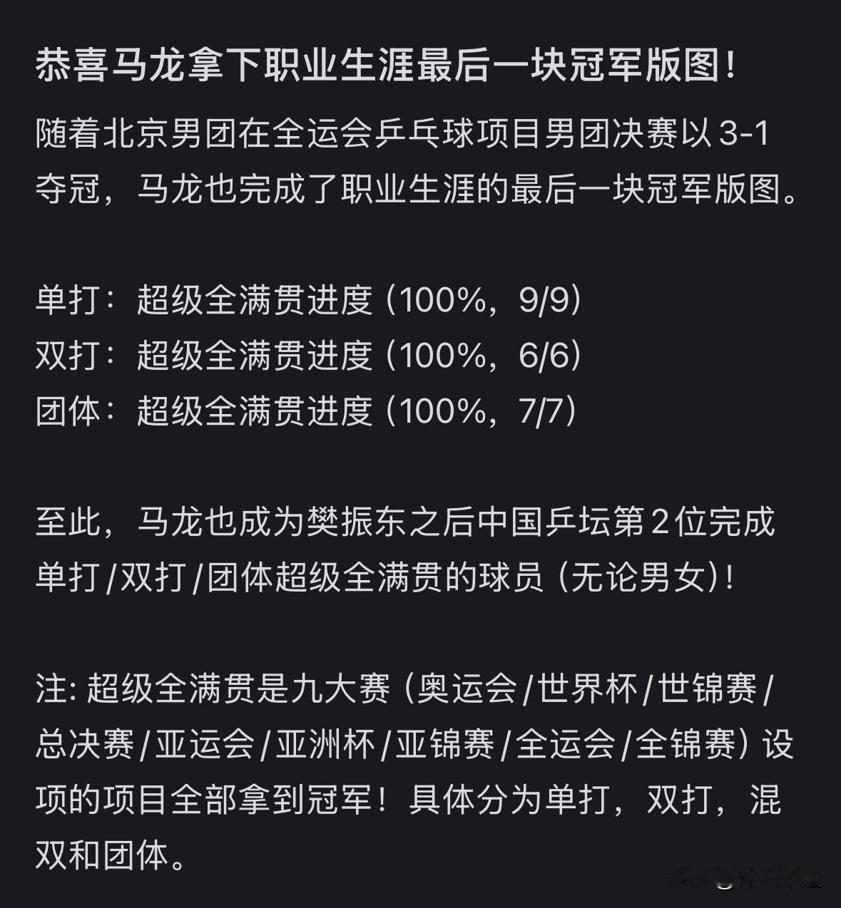 🎉🎉马龙成就全运会乒乓球男团冠军🏆 马龙太牛啦!在第十五届全运会乒乓男团金牌赛上,他和王楚钦、黄友政率领的北京队 3 - 1 战胜上海队夺冠。这一胜利让马龙完成全运会最后一块团体金牌拼图,实现全运会大满贯,成为全运会历史上唯一夺得乒乓球男子全部 4 个项目金牌的选手。 37 岁的马龙 6 次参加全运会共获 5 枚金牌。这场决赛堪称“地表最强对决”,首盘双打北京队马龙/黄友政 3 - 1 取胜,第二盘王楚钦对阵樊振东,樊振东逆转胜出扳平比分,最终北京队还是拿下胜利。马龙真不愧是乒坛传奇,实至名归!