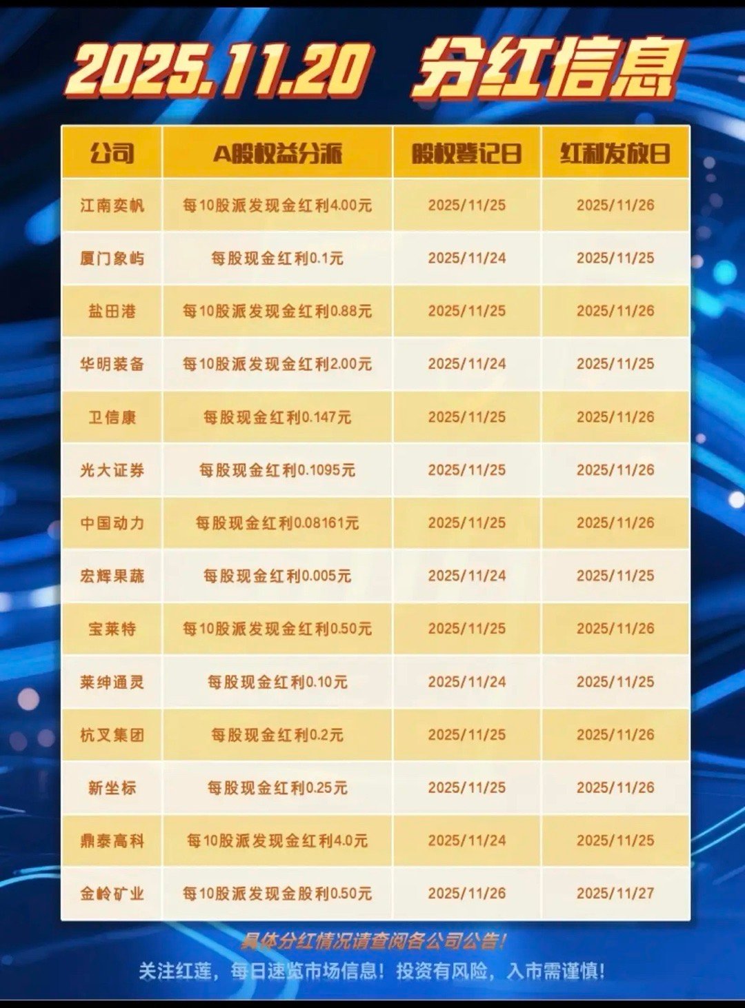 11.20 最新公告:下周将分红送股公司!下周15家公司披露分红: