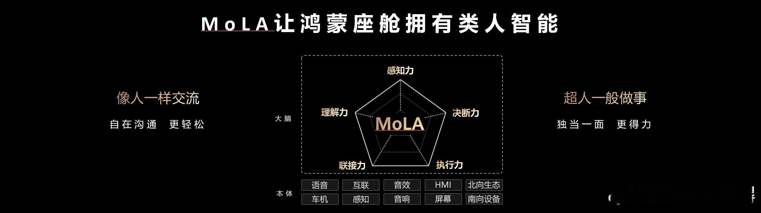 华为乾崑生态大会发布MoLA架构,鸿蒙座舱率先迈入 L3 智能时代2025 年 11 月 20 日,华为乾崑生态大会在广州盛大启幕,会上鸿蒙座舱携 MoLA 混合大模型 Agent 架构重磅亮相,不仅首推座舱智能化 L1 - L5 五级分级标准,更以全感官体验、自然交互与主动服务三大方向,重塑智能座舱行业发展格局。目前鸿蒙座舱用户数已突破 120 万,2025 年 1 - 10 月问界车型搭载版本的平均净推荐值达 93.6%,成用户口碑之选。作为 HarmonySpace 5 起采用的核心架构,MoLA 通过融合多模态感知、通用大模型与垂域智能体,搭建起从用户意图到硬件执行的完整链路。其独创的全域免唤醒、导航三模式纠错等功能,让语音交互告别指令束缚。用户说 “车里有点暗” 即可开启阅读灯,导航时可随时改口调整目的地,彻底实现口语化控车。此次大会明确鸿蒙座舱率先进入 L3 专业助理阶段。相较于前两级,L3 阶段具备长期记忆、模糊意图理解等核心能力,可主动提供服务。依托感知力、记忆力等六大类人能力,座舱能记住用户通勤习惯并主动创建场景,还可通过图文视频混合形式解答用车疑问,甚至联动外部工具完成咖啡预订等跨场景任务。生态构建上,鸿蒙座舱以 MoLA 为核心,联动北向与南向双生态。北向新增 HUAWEI SOUND 空间音专区及云游戏,腾讯云游戏上线后可即点即玩热门网游;南向则实现智能香氛与氛围灯联动等外设智能交互,打通人车家无缝协同。华为通过行业 Know - How、全栈 AI 算法等能力,让 MoLA 架构实现软硬件深度融合。此次发布不仅展示了导航、车控等五大智能体的实战能力,更以标准化分级为行业提供参考,推动智能座舱从出行工具向 “第三生活空间” 加速演进。