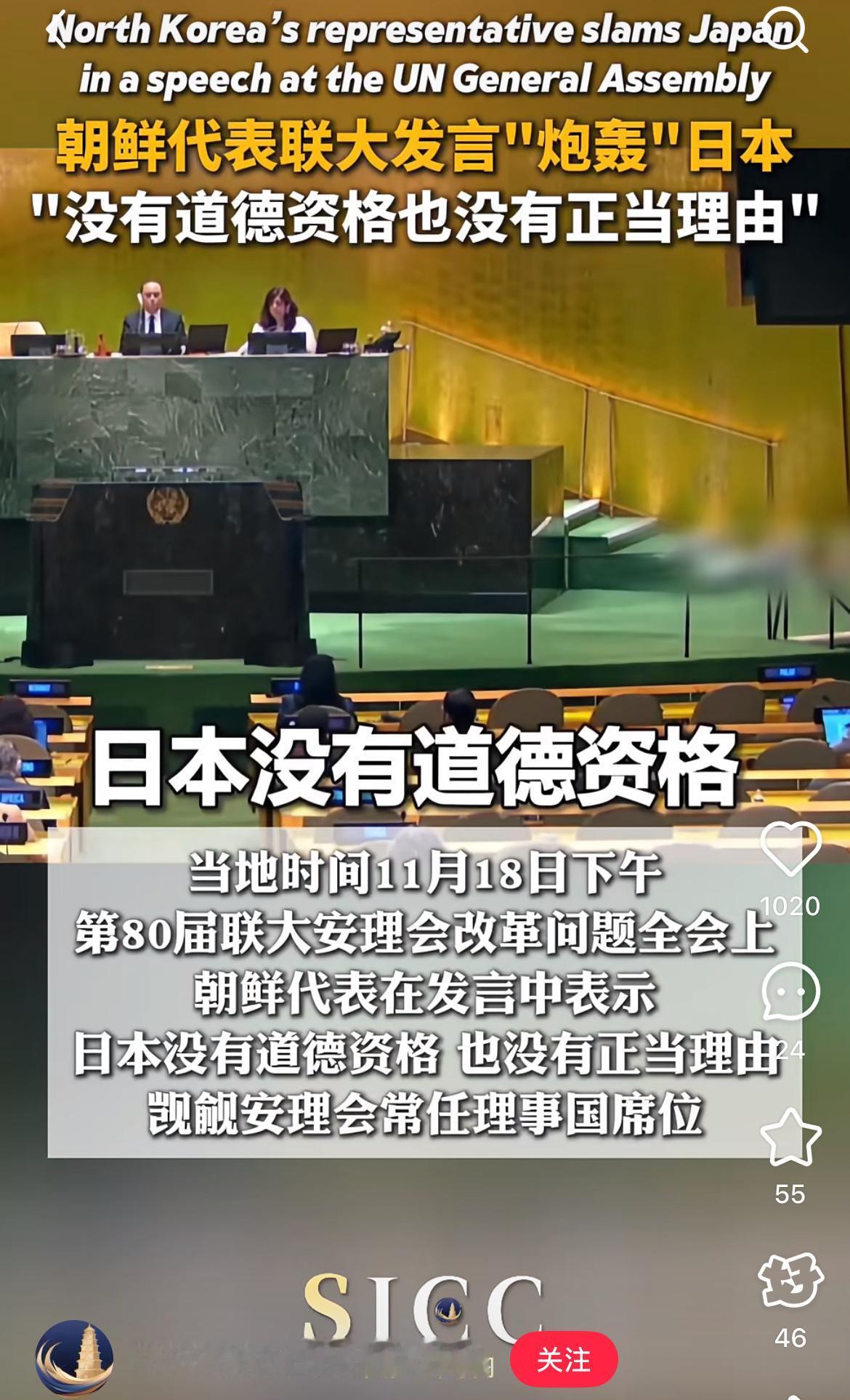 朝鲜这波联大发言太提气! 不是跟风站队, 而是把正义说到了根子上——连历史罪行都不敢认的国家,压根没资格觊觎安理会常任席位。 日本一边删改教科书、参拜靖国神社,一边鼓吹“台湾有事即日本有事”,还想靠砸钱搞“入常”,这种又当又立的操作早该被戳穿。 朝鲜代表字字铿锵,把强征劳工、慰安妇惨案这些血淋淋的事实摆到190多个国家面前,这份敢说真话的硬气,比多少虚与委蛇的外交辞令都管用。 最难得的是,这不是孤立的发声,而是中朝乃至更多受害国的正义共鸣。 历史从不是任人打扮的笑话,那些苦难记忆容不得半点篡改。 敢于直面强权、坚守历史真相,这才是国际社会该有的样子。 你觉得朝鲜这番发言,能让日本正视历史吗?来评论区聊聊你的看法!