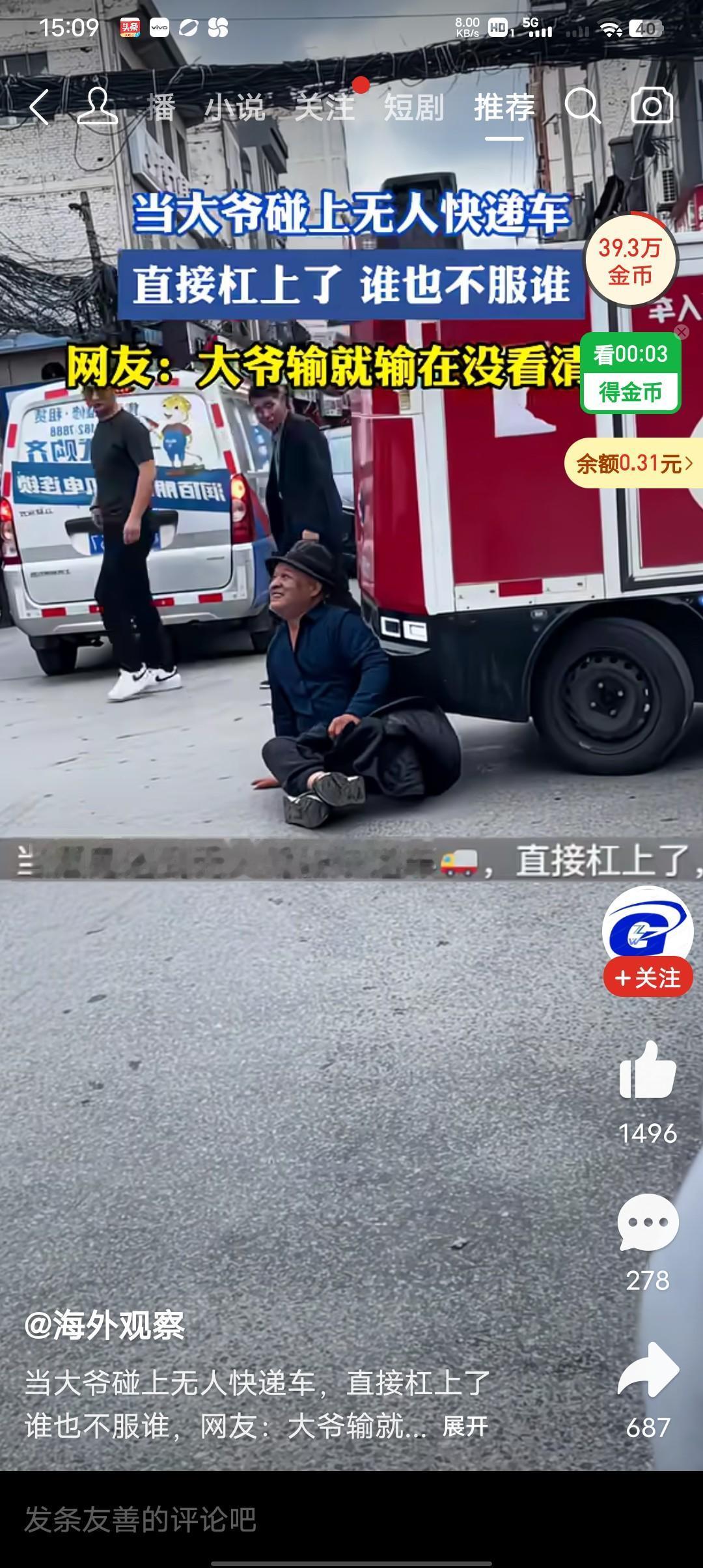 当酒鬼大爷碰上无人驾驶快递车,直接杠上了,谁也不服谁! 有网友说,大爷输就输在没看清车上的字,无人驾驶会不会干倒碰瓷的呢?我在想到最后谁会妥协呢?大爷坐在无人驾驶快递车前面,已经被车子推着往前滑了好几步。看这个样子车子是不认输的,至于大爷是不是不认输,就是不知道谁才能坚持多久了! 我觉得应该大爷坚持不了多久,因为还得回家吃饭不是,总不能一直被车拱着吧,毕竟无人驾驶不用回家吃饭。怎么看都是一出闹剧呢?有谁知道最后是谁妥协了吗?