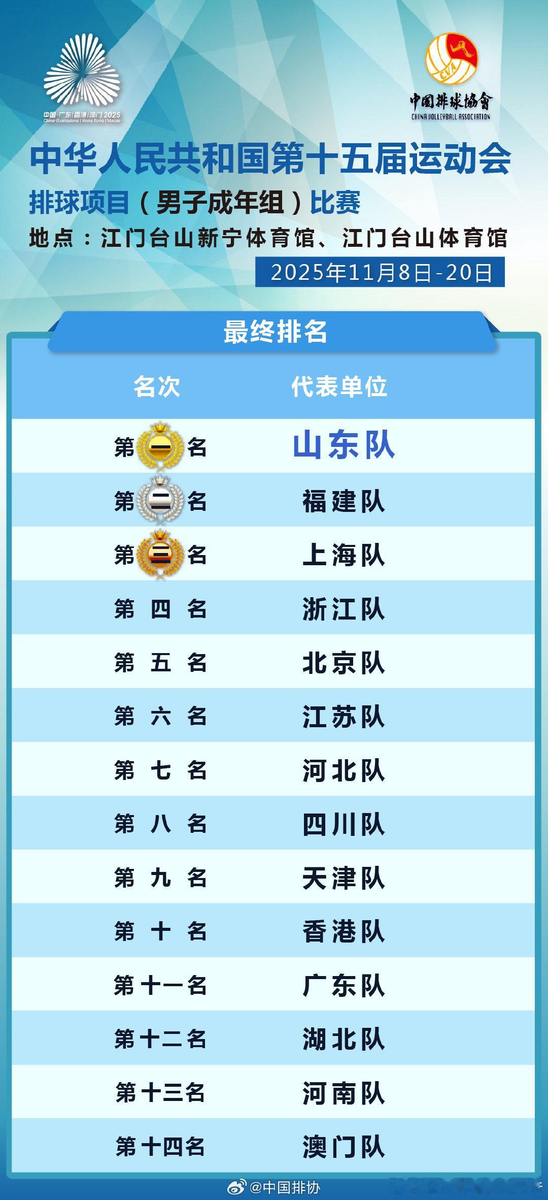 🏐男子成年组在江门落幕。山东队夺冠,福建队获得亚军,上海队获得季军。cr: