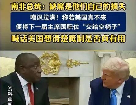 美拒参G7活动南非外长明确表态:即便美国缺席, 世界前进的脚步也不会停歇! 从美国这一拒绝行为深入剖析,不难发现其背后蕴含着复杂的战略意图与心态转变。近年来,美国在外交政策上愈发倾向于单边主义,始终将本国利益置于首位。面对像 G20 这种需要在多边框架下进行广泛协调与合作,并且可能对其行动产生一定约束的国际平台,美国表现出明显的消极抵触情绪。要知道,G20 作为全球至关重要的经济合作论坛,一直致力于推动全球经济增长、维护国际金融稳定以及强化全球经济治理。美国此番拒绝参与,无疑是对这种集体合作模式的公然背离,暴露出其妄图在国际事务中按照自身想法“独自行动”的野心。 南非外长那句坚定有力的回应,不仅展现出国际社会其他国家对美国此类单边行为的清晰认知,更彰显了一种不容置疑的坚定立场。这意味着世界格局正加速朝着多极化方向迈进,尽管美国在国际事务中至今仍具备相当影响力,但已无法再像过去那样掌控一切。当下,其他国家和地区都在积极投身多边合作,全力构建一个更为公平合理的国际秩序。即便美国选择置身事外,全球合作的步伐也不会受阻。世界各国将持续围绕诸多全球性问题,例如气候变化、疫情防控以及经济复苏等,携手展开合作,共同寻求应对之策。这一回应也像是给美国敲响的一记警钟,提醒其不可再对国际社会的共同意愿和发展大势视而不见,肆意推行单边主义政策。