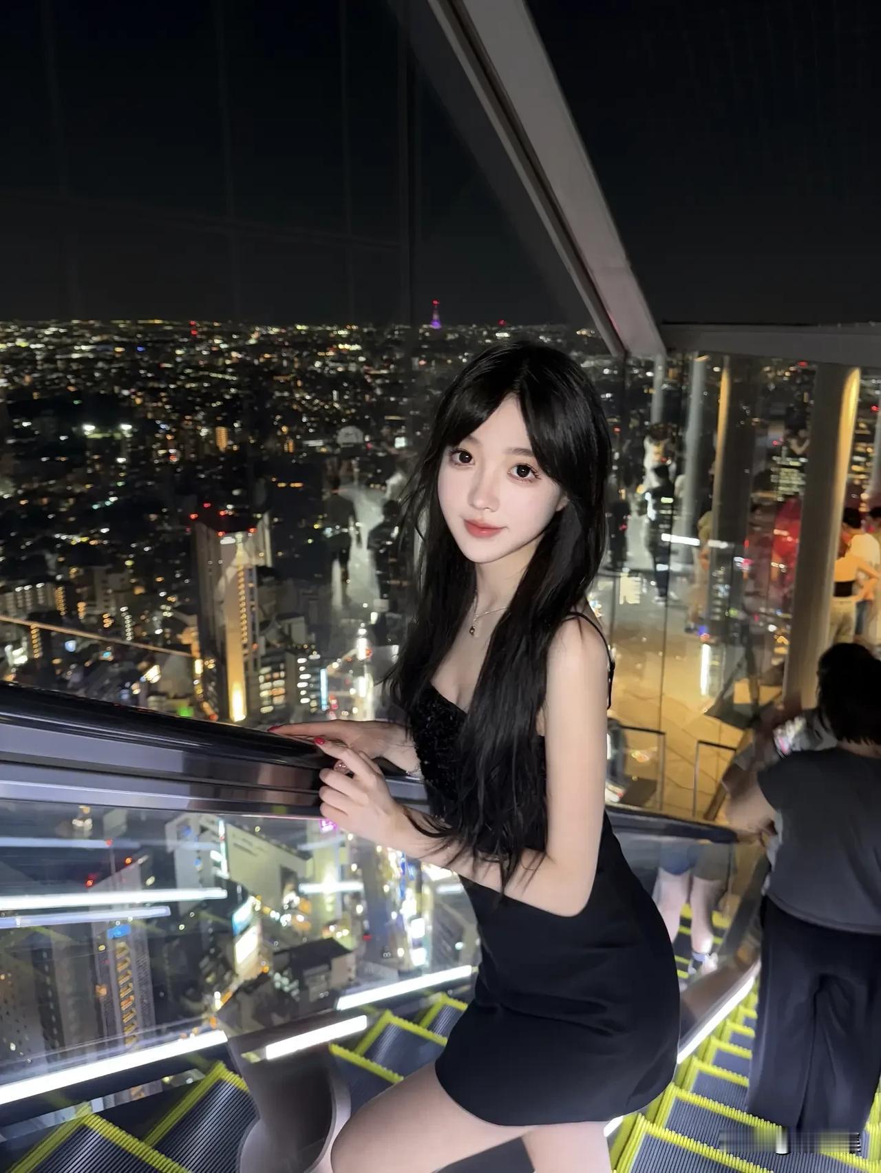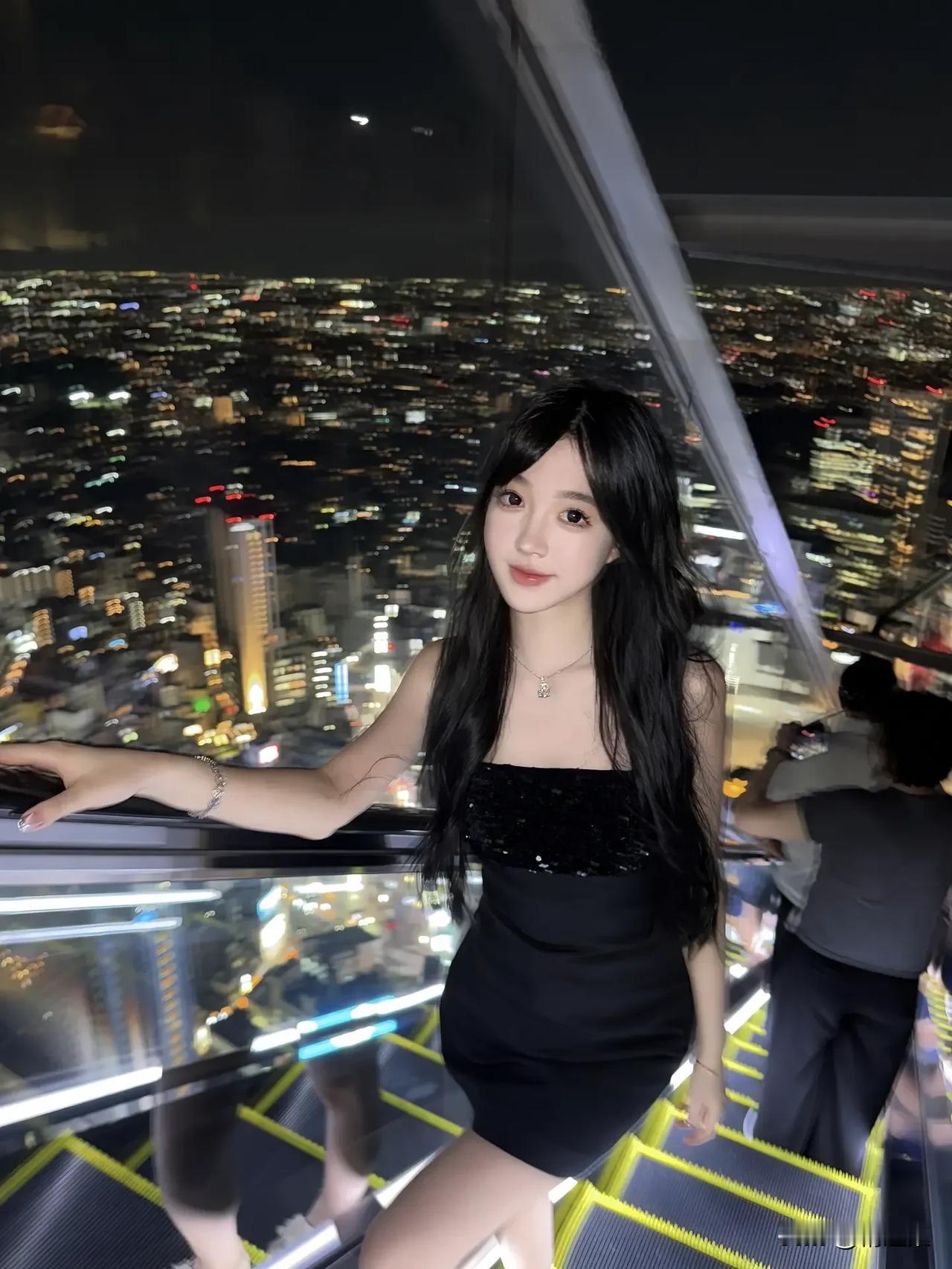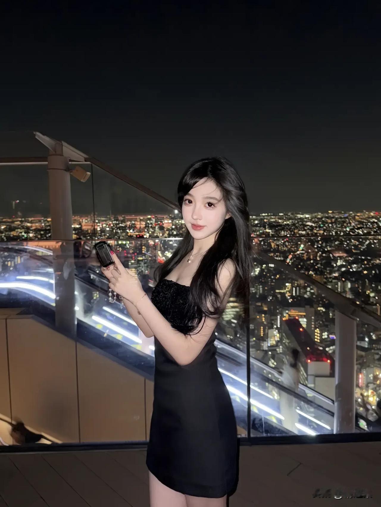 夜晚城市灯火璀璨,少女在摩天大楼顶楼自拍,黑裙闪耀,美不胜收!🌃✨👗📸