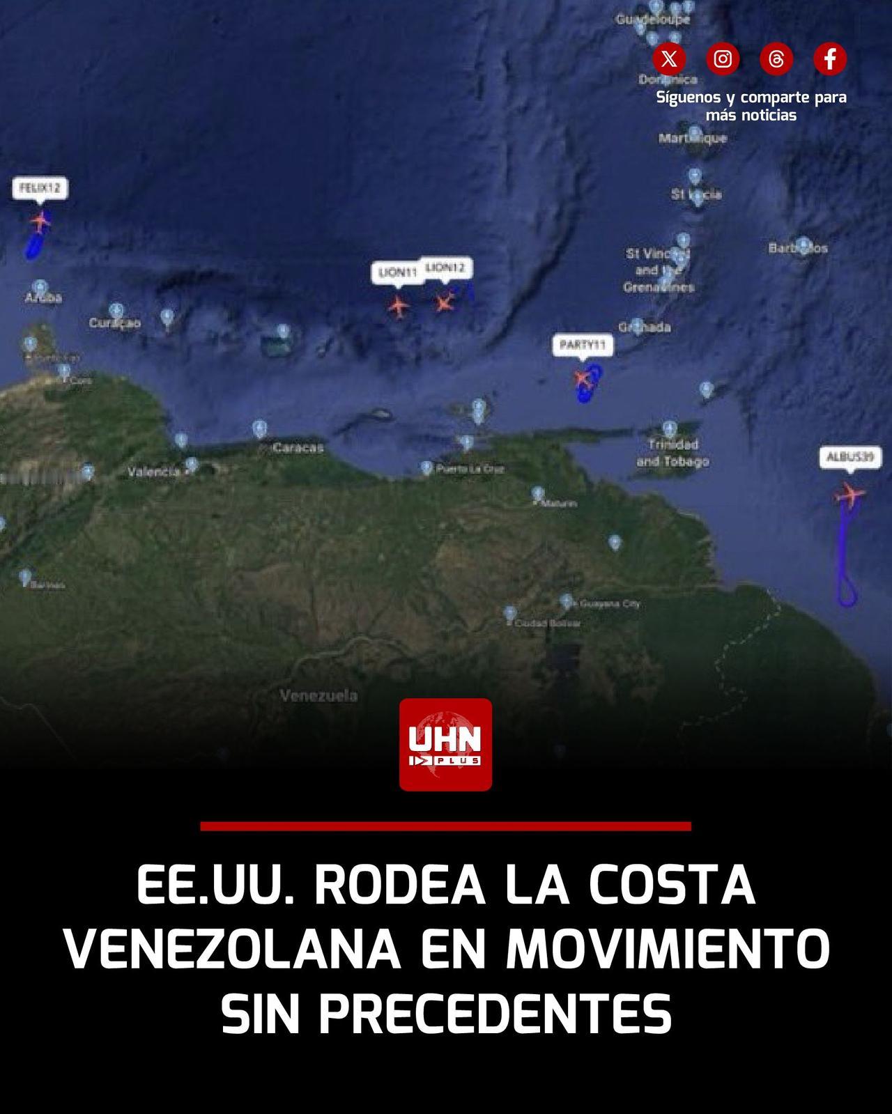 紧急快讯——美国五架军用飞机沿委内瑞拉整个海岸线开展飞行演练,范围从埃塞奎博至法尔孔州,此举加剧了该地区的紧张局势。