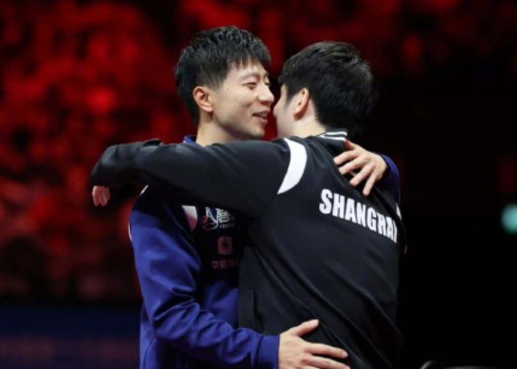 比赛结束后,马龙和许昕拥抱,马龙和樊振东拥抱致意。致敬老将,致敬热爱!