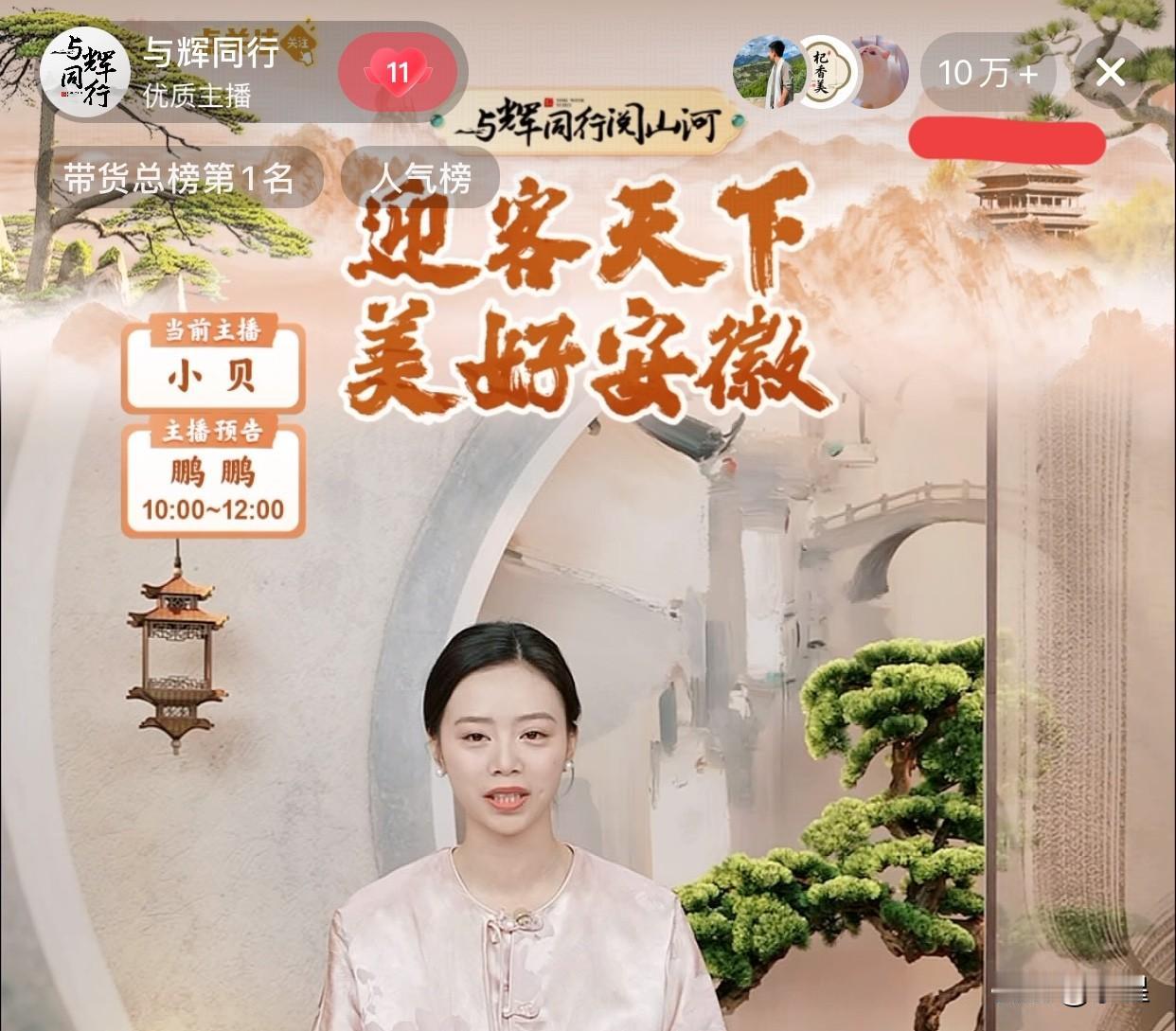 今天与辉同行安徽行正式启动 一大清早直播间里热闹非凡 小贝正在朗诵一篇非常优美的文章 在线人数迅速飙升至10万+ 货盘里199件安徽好物 看得人眼花缭乱 小贝还没开始介绍 就看见屏幕右下侧飘着1500+ 那是大家在加购的数字 而且随着不断滚动 数字逐渐变大 每次阅山河都是这样 大家是等不及主播介绍的 看到需要就赶紧下单 否则等到中午董宇辉开播 很多好物早就售罄了[呲牙] 友情提醒 董宇辉开播时间是12点 大家别错过了哟[耶]