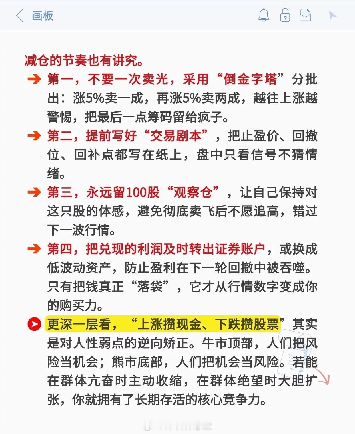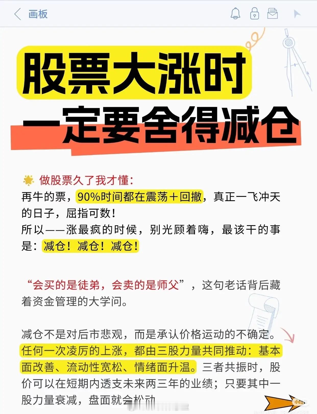 股票大涨时的减仓策略与仓位管理:在波动中稳健积累复利股票大涨时的减仓与仓位管理,核心是通过科学策略对抗市场不确定性与人性弱点,最终实现长期稳健盈利。其核心逻辑与操作要点可拆解为以下三部分:首先,明确“大涨时为何要减仓”。再强势的股票,90%的时间都处于震荡或回撤中,真正凌厉上涨的时段极少,大涨正是兑现部分利润的关键窗口。需要特别注意的是,减仓不等于看空后市,而是承认市场波动的本质——股票的强势上涨往往依赖基本面、流动性、市场情绪三股力量共振,任一因素减弱都可能触发回调,提前减仓是应对这种不确定性的“防御动作”。其次,掌握“如何科学管理仓位”。建议将总仓位清晰划分为三部分,通过动态调整实现风险与收益的平衡:• 底仓:作为长期持仓核心,除非个股基本面出现恶化,否则不轻易变动,确保不踏空长期趋势;• 滚动仓:用于波段操作,遵循“急涨减仓、急跌补仓”的原则,通过高抛低吸持续降低持仓成本;• 现金仓:始终保留总资金10%以上的现金,市场过热时可提升至50%以上,既是应对风险的“安全带”,也能在市场回调时抓住低吸机会。通过这种分仓方式,可根据市场热度灵活调整仓位,让整体持仓成本低于市场平均水平,为复利增长奠定基础。最后,落地“减仓的具体技巧与深层逻辑”。操作层面需注重节奏把控,同时理解背后的人性逻辑:• 减仓节奏:采用“倒金字塔式”分批卖出,即涨势越猛、卖出比例越高,例如首次涨5%时卖出1成仓位,再涨5%时卖出2成仓位,避免一次性清仓导致“卖飞”;提前制定“交易剧本”,明确止盈点位、回调后的回补时机,减少盘中情绪干扰;可留100股“观察仓”,保持对个股走势的敏感度,同时及时将兑现的利润转出或置换为低波动资产,确保盈利“落袋为安”。• 深层逻辑:投资长期盈利的核心,是对抗人性的“羊群效应”。当市场狂热(如全民讨论炒股、成交量激增)时,主动收缩仓位、积累现金;当市场冷清(如投资者普遍绝望、交投低迷)时,大胆用现金加仓、积累优质股票——这种“别人贪婪我谨慎,别人恐惧我贪婪”的逆向操作,才是穿越牛熊的核心竞争力。一句话提炼:大涨时减仓是资金管理的核心,通过“分仓策略+科学减仓技巧+逆向人性操作”的组合,才能在波动的市场中持续降低风险、积累复利。