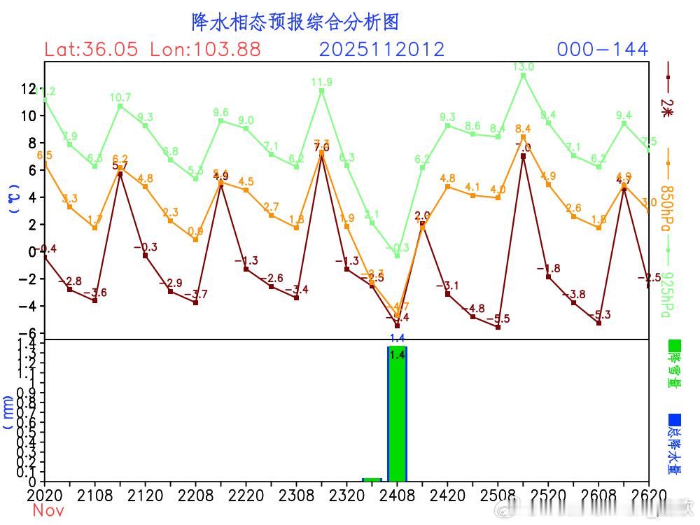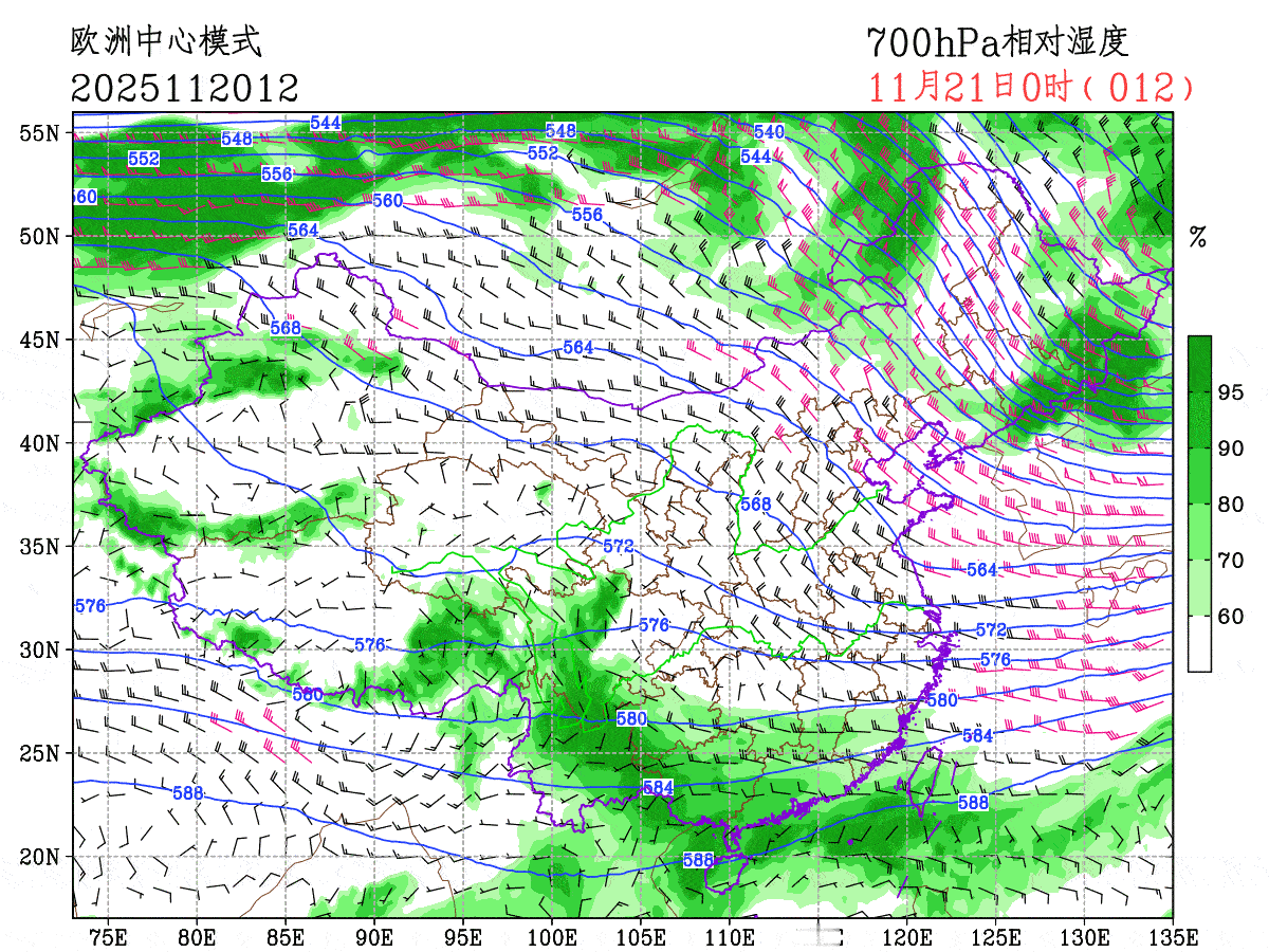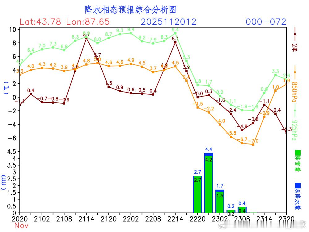 【降水】昨天到今晨,在西南和东北部分地区有分散的雨雪出现。今后3天,我国中东部的降水依然不多,主要出现在西部地区。受到南支槽影响,西藏东北部、青海南部、四川西北部将有降雪,西藏东南部、云南北部、四川东部、重庆一带有降雨。22-23日因为冷空气东移南下,新疆、甘肃等地自西向东将有降雪。图5-6为乌鲁木齐的单站预报,相比昨天的数值预报,乌鲁木齐的水汽、动力条件有所增强,降雪量级可能达到大雪级别。降雪主要出现在22日17时-23日08时。图7-8为兰州的单站预报,水汽动力条件比乌鲁木齐还是弱了不少,24日02-08时期间存在降雪机会,但并不保证一定能下。图9为今后3天,总体形势场的预报。