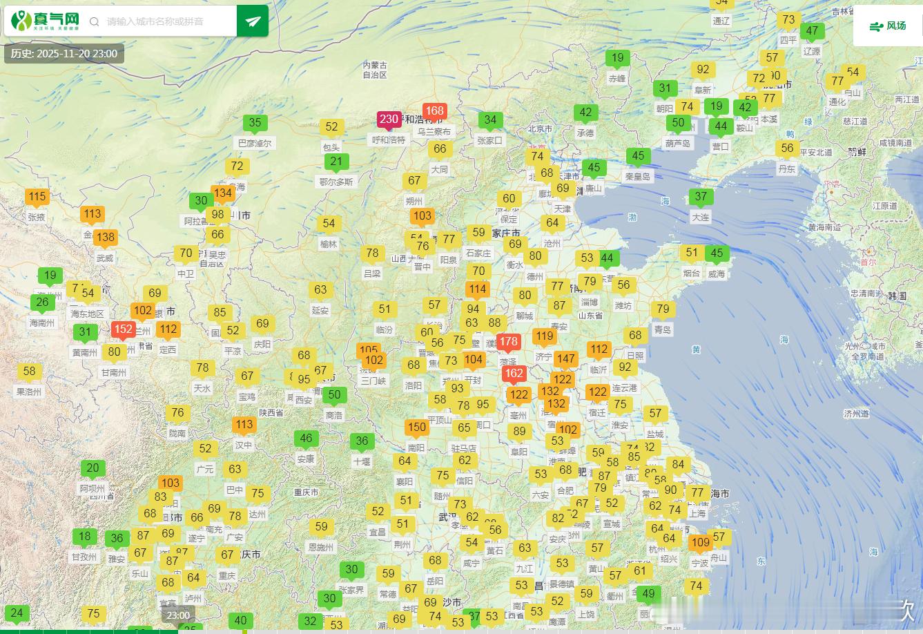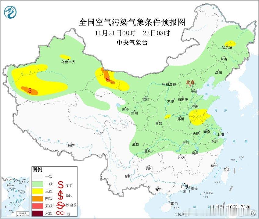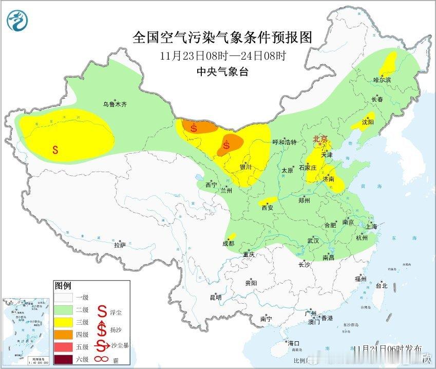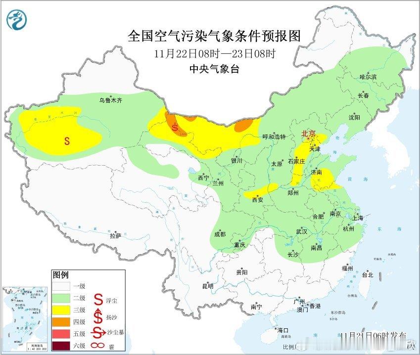【霾和沙尘】昨晚到今晨,在安徽北部、河南东部一带,污染物堆积,出现了些中度污染,对应有霾。今明2天,低空逐渐转为偏南风,部分霾可能向北输送,并在太行山和燕山下堆积。24日随着冷空气东移南下,扩散条件总体好转。不过22-23日,冷空气扫过新疆甘肃内蒙古宁夏等地时,也可能导致局地沙尘。