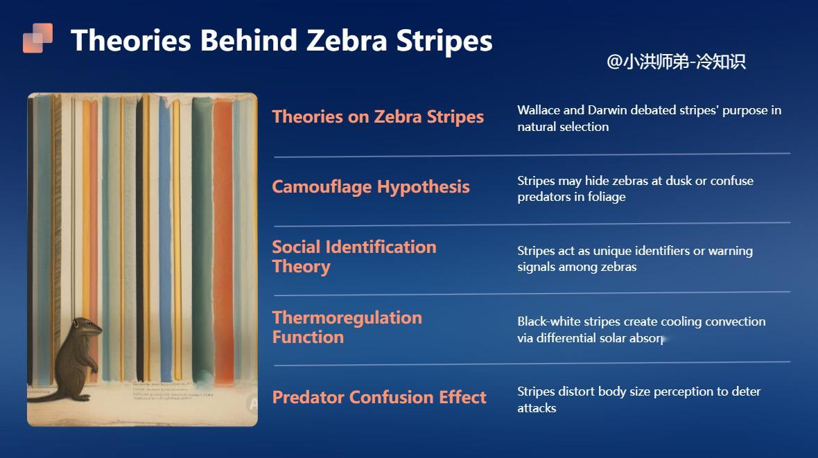 为什么斑马有条纹呢?19世纪的阿尔弗雷德·拉塞尔·华莱士和查尔斯·达尔文是“自然选择”理论的共同创始人,他们二人对此问题展开了争论。华莱士称,斑马身上的条纹使它们在黄昏时分去河边饮水时不容易被捕食者发现。而达尔文称,那是无稽之谈,条纹根本不能提供任何的保护作用——但达尔文说,他认为这些条纹很美。还有人认为,条纹可以在长长的树叶中起到伪装的作用,斑马身上的条纹可以迷惑捕猎者,因为它们很难从眼花缭乱的条纹中识别出弱小的斑马幼仔。也有人认为,条纹是一种让斑马能够识别彼此的条形码,黑白相间的条纹通常是一种警告信号,条纹使捕食者很难判断出动物的身形有多大。还有人认为,黑白条纹吸收了不同程度的太阳辐射,因此在动物的皮肤上形成了一个对流降温系统。||