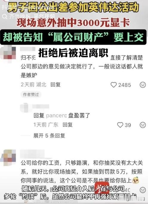 这么离谱的事还真是少见啊,抽中的东西不是应该归个人吗?不管哪个公司办活动不都是这样吗?怎么还属于公司财产了呢?这格局如此小的吗?那肯定走不远。 一位上海某公司的实习生因为出差,在活动现场参与集章抽奖,意外抽中了一张3000元的显卡;还没有来得及高兴,公司同事告诉他显卡属于公司财产,财务已经知道了,需要上交。 好多网友建议把这个公司爆出来,让大家都知道,什么公司如此厉害。 这种公司确实也没有必要待下去,没有任何意义。 大家怎么看待这件事呢?