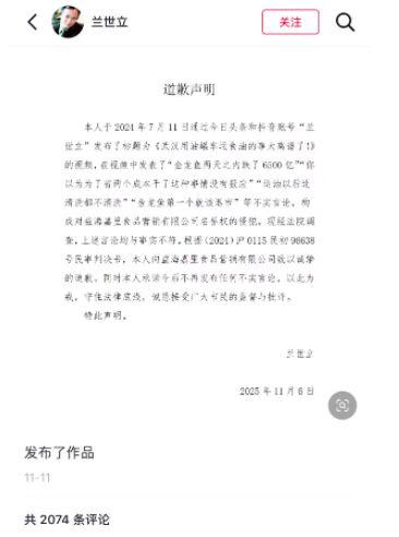 11月11日,湖北前首富兰世立在抖音发道歉声明,为去年7月对金龙鱼的不实言论致歉。当时他发视频称“金龙鱼两天之内跌了6500亿”“运油以后连清洗都不清洗”“金龙鱼第一个就该退市”等。 经法院调查,这些言论与事实不符。益海嘉里起诉后,法院两审认定兰世立侵权,判他赔偿1万元和律师费,还要公开赔礼道歉。兰世立称是遵照判决发声明,但对缺席审判有不同意见。兰世立经历传奇,有“中国民营航空第一人”之称,这次因不实言论道歉,也给大家提了个醒,说话做事得守住法律底线。