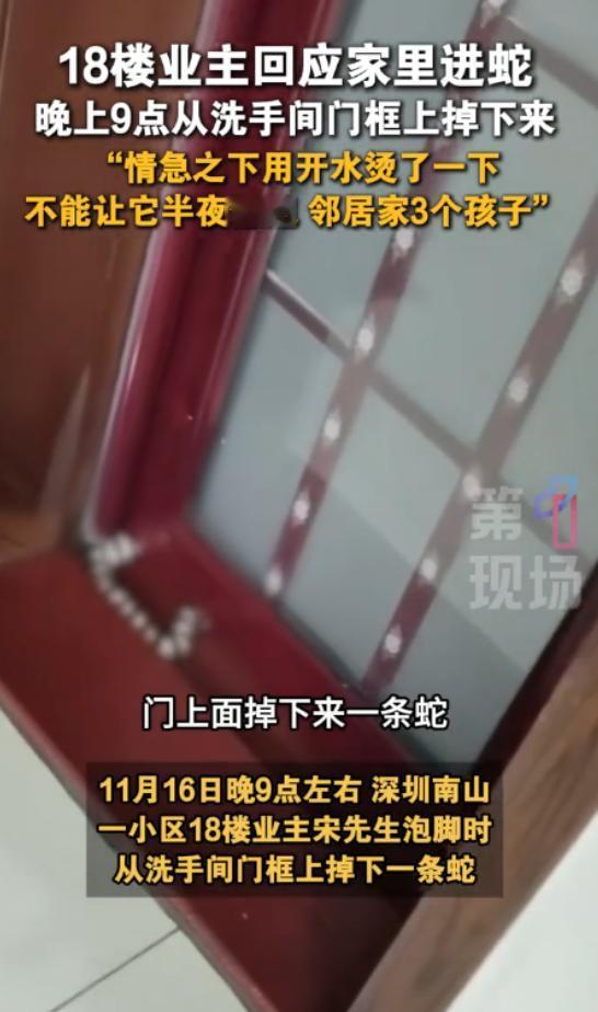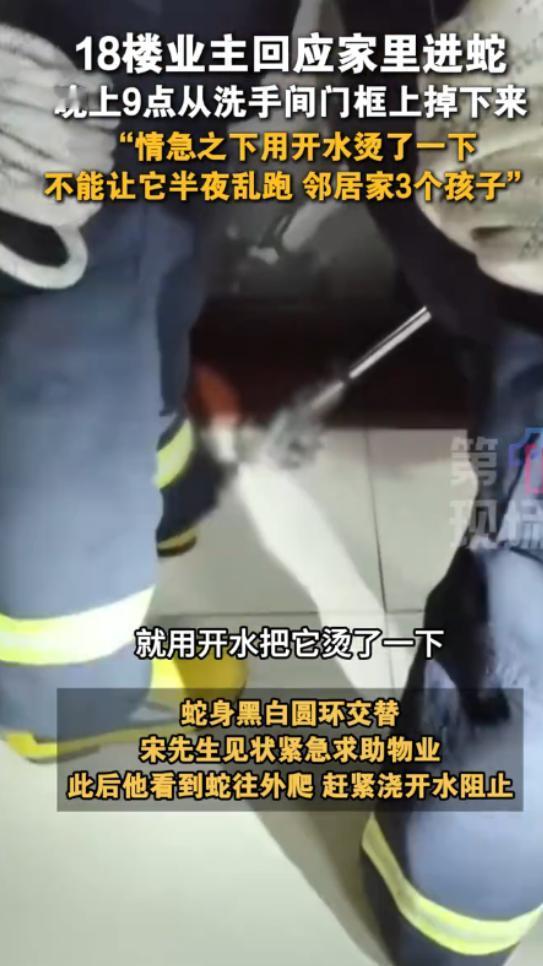 “太可怕了!”11月16日,广东深圳,一男子家住18楼,他在家泡脚时,卫生间突然传来“砰”的一声巨响,男子立即穿上拖鞋过去查看,发现地上有一条黑白相间的蛇,见蛇要逃跑,男子赶忙用开水泼了过去!物业:不是上下几层住户养的。 11 月 16 号晚上 9 点多,宋先生忙完一天的工作,累得腰酸背痛,回到家就想好好放松一下。他端了一盆滚烫的热水,躺在客厅沙发上泡脚,本来是挺惬意的事儿,家不就是用来卸下心防、好好休息的地方嘛,谁能想到会遇上这种惊魂一幕? 突然 “砰” 的一声巨响,从卫生间那边传过来,声音沉沉的,像是有什么重物掉在了瓷砖上,宋先生一开始没往坏处想,还以为是水管爆了,或者是墙上的置物架松动掉了,毕竟住高层,偶尔会有设施老化的情况。他赶紧擦干脚,穿上拖鞋就往卫生间跑,想着要是漏水了还得赶紧处理,别泡坏了地板。 结果一推卫生间的门,宋先生当场就僵住了腿都软了!地上哪儿是什么掉了的东西,赫然盘着一条黑白条纹相间的蛇!那蛇看着还不算短,黑白相间的花纹看着就怵人,谁知道有没有毒啊?宋先生当时脑子一片空白,只觉得头皮发麻,心脏砰砰直跳,手心全是汗,真的太可怕了! 那蛇好像也被突然出现的人吓了一跳,愣了一下之后,就开始往墙角蠕动,看那样子是想找缝隙躲起来,宋先生这才反应过来要是让它钻进卧室床底,或者顺着门缝溜到楼道里,不管是自己还是邻居,都太危险了!当时情况太紧急,他根本没时间找棍子、扫帚这些东西,眼瞅着旁边就是刚才泡脚的热水盆,水还是滚烫的,他想都没想,端起来就朝着蛇的方向泼了过去。 事后有人在网上讨论,说这样是不是不太人道,但换做是任何一个普通人,在那种生死关头,面对一条不知道有没有毒的蛇,除了赶紧阻止它靠近,还能有别的办法吗?当时肾上腺素都飙到顶了,脑子里就一个念头,不能让它跑了绝不能让它伤人! 泼完开水之后那蛇就蜷缩在原地不动了,宋先生也不敢靠近,赶紧掏出手机报警,还联系了小区物业,等消防救援人员赶到的时候,宋先生还心有余悸,站在客厅里都不敢往卫生间那边看。 消防员用专业的工具把蛇装了起来带走了,虽然蛇被处理了,但宋先生一晚上都没睡好,闭上眼睛就是那条黑白相间的蛇,心理阴影真的太大了。 最让人想不通的是,18 楼啊!离地面几十米高,蛇又没有翅膀,它到底是怎么爬上来的?这事儿不仅宋先生想不通,小区里的其他业主知道了之后也都慌了,纷纷担心自家会不会也遇到这种情况。 物业赶紧组织人进行了地毯式排查,首先就问了宋先生上下几层的邻居,有没有人养爬宠,比如蛇之类的。结果一圈问下来,邻居们都一口否认,说从来没养过这种冷血动物,也不喜欢这些东西,这么一来,“宠物越狱” 的说法就彻底站不住脚了。 那蛇总不能是凭空出现的吧?后来专业的人来勘察,才发现问题可能出在卫生间的通风管道上,咱们平时家里的通风口、管道连接处,可能会有一些不起眼的小缝隙,平时打扫卫生都忽略了,可对于蛇这种身体柔软、会缩骨的动物来说,那些缝隙就跟 “高速公路” 一样,能顺着外墙的管道或者内部连通的排气道,一点点往上爬。 而且深圳 11 月中旬的天气还挺暖和,大概 20 摄氏度左右,正是蛇类准备冬眠前 “贴秋膘” 的活跃期,估计就是顺着这些隐秘通道,硬生生完成了一次 “高层攀岩”,闯进了宋先生家。 事情发生后物业也挺重视的,第二天就在小区的公共区域抛洒了雄黄粉,不过说实在的,雄黄粉更多是给大家一个心理安慰,真要防蛇还得从根源上入手,那些通风口的防护网有没有破损,管道连接处是不是密封严实了,空调外机的缝隙有没有堵住,这些平时被我们忽略的小细节,现在看来都是关乎安全的大事。 现在想想宋先生真的太倒霉了,也太勇敢了,住在 18 楼还能遇上蛇,这种概率简直跟中彩票似的,但偏偏就发生了。那条黑白相间的蛇到底是有毒的银环蛇,还是有人弃养的宠物蛇,现在还不清楚,但它带来的恐惧感,却让整个小区的人都心有余悸。 (信息来源:《深圳南山一小区住在18楼的业主反映,11月16日晚上9点,从洗手间门框上突然掉下一条蛇,“情急之下用开水烫了一下,不能让它半夜乱跑,邻居家3个孩子”。》第一现场)