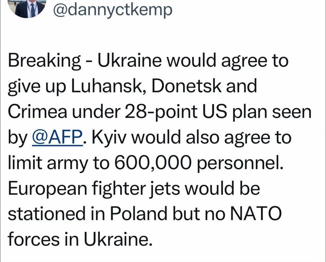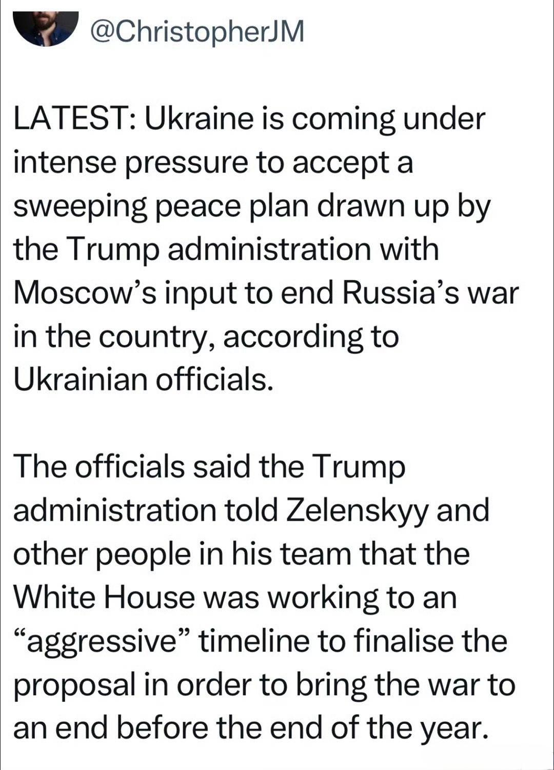 俄乌战争真看见结束的曙光了?泽连斯基表态愿意接受新和平方案。 白宫新闻秘书卡罗琳·莱维特昨天(11月20日)说:“国务卿和特使就该计划已悄悄地工作了大约一个月,他们与乌克兰和俄罗斯进行了同等的接触,以了解双方将做出哪些承诺来确保持久和平。 随着与交战双方的谈判继续进行,这项计划仍处于变化中,对俄罗斯和乌克兰来说都是一个好计划,我们认为它应该被双方接受。我们正在非常努力促成此事。 美国陆军部长丹·德里斯科尔昨天在基辅与泽连斯基讨论了这个计划。莱维特表示,德里斯科尔在会晤后感到非常乐观。” 泽连斯基昨天发贴说,“我的团队将与美国讨论这个计划的条款以结束战争。我们已准备好开展建设性、诚实和迅速的工作。和平是必要的,我们赞赏特朗普总统及其团队为恢复欧洲安全所做的努力。"